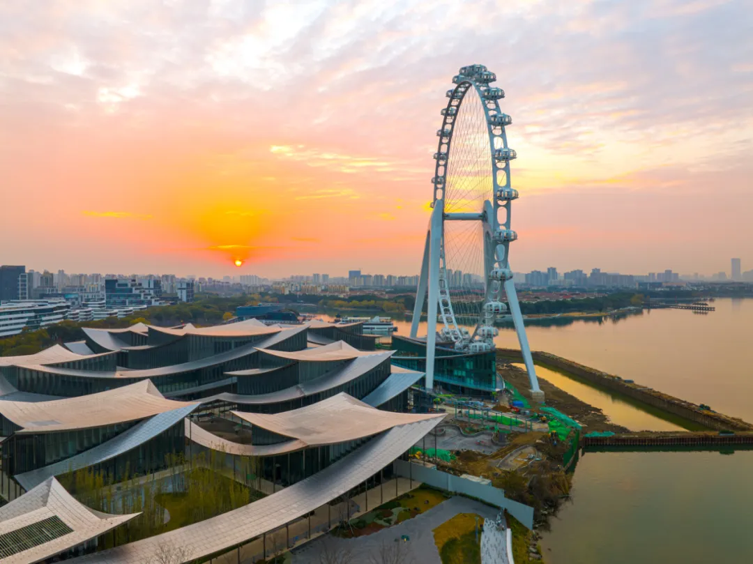 是亚洲最大的水上摩天轮之一,高度达128米,拥有28个回转式太空舱,可360度俯瞰金鸡湖美景。