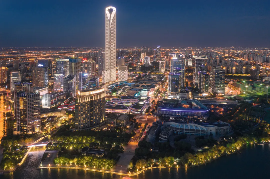 苏州国际金融中心是江苏省第一高楼,位于苏州工业园区湖东CBD核心区,总高450米,集超甲级写字楼、奢华酒店与商业功能于一体。