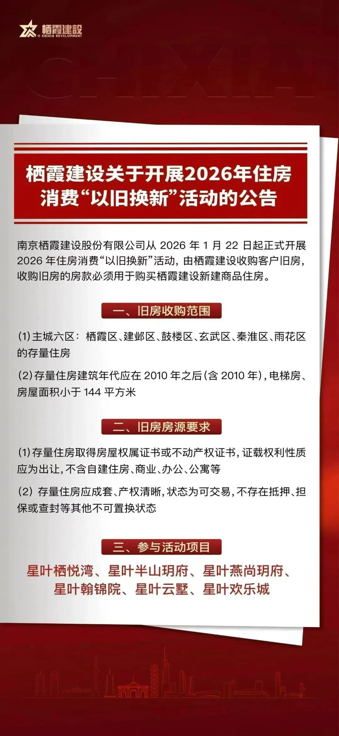 近日,南京本土知名国企栖霞建设正式开启“以旧换新”活动!