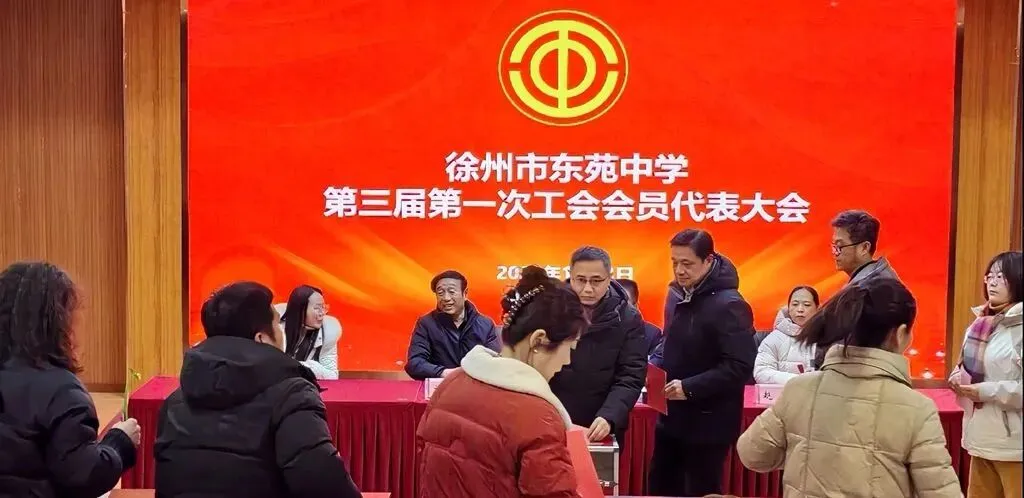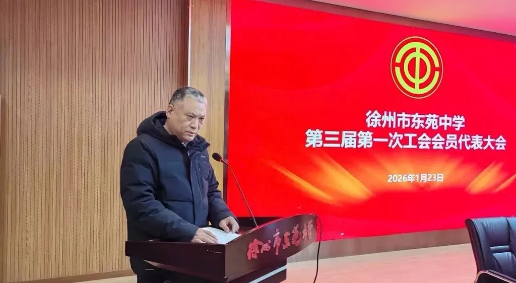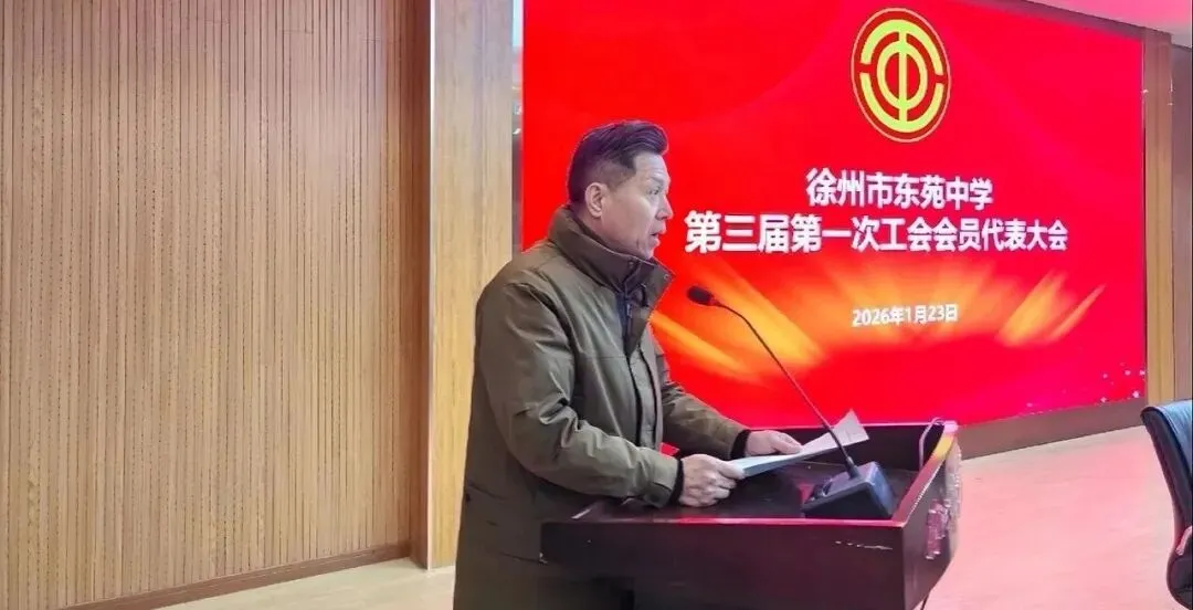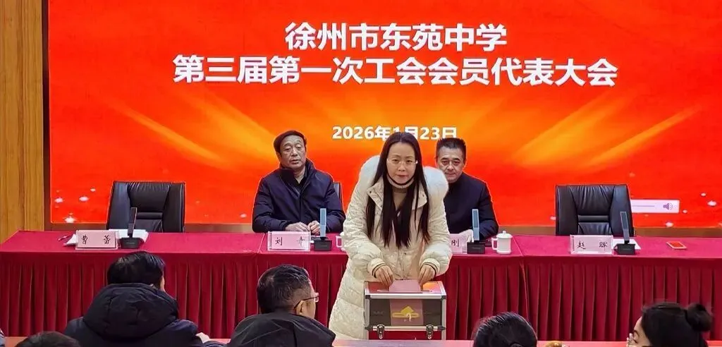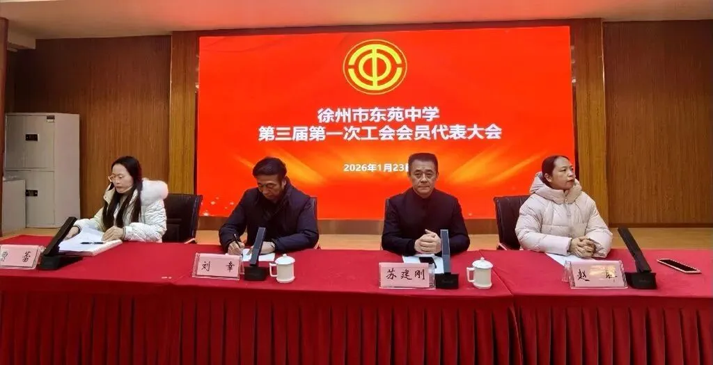 2026年1月23日下午,徐州市东苑中学工会第三届第一次会员代表大会隆重召开。市教育局工会苏建刚主席、刘幸副主席,东苑中学党支部书记、校长赵晖同志,副书记曹蕾同志出席会议,70余名会员代表参加了此次盛会。