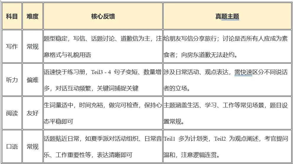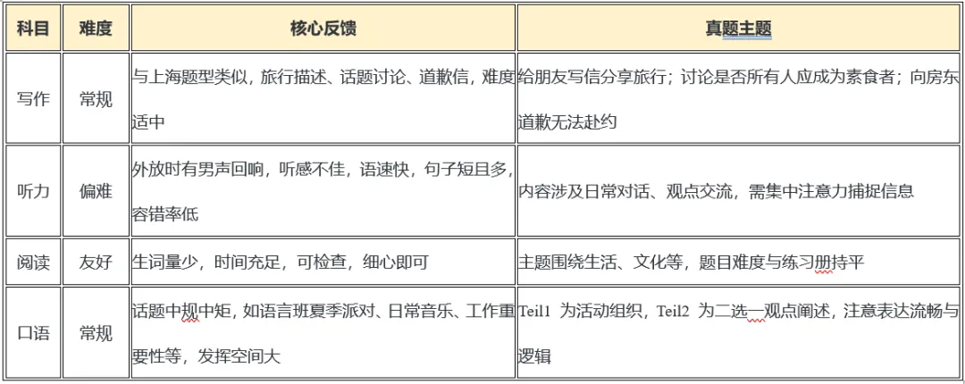 上海和南京考场的普遍反馈是听力难度相对较大,且听力在今年的变化比较明显,小短句更多、信息更分散。文末有备考建议,可以直接滑到底部查看。