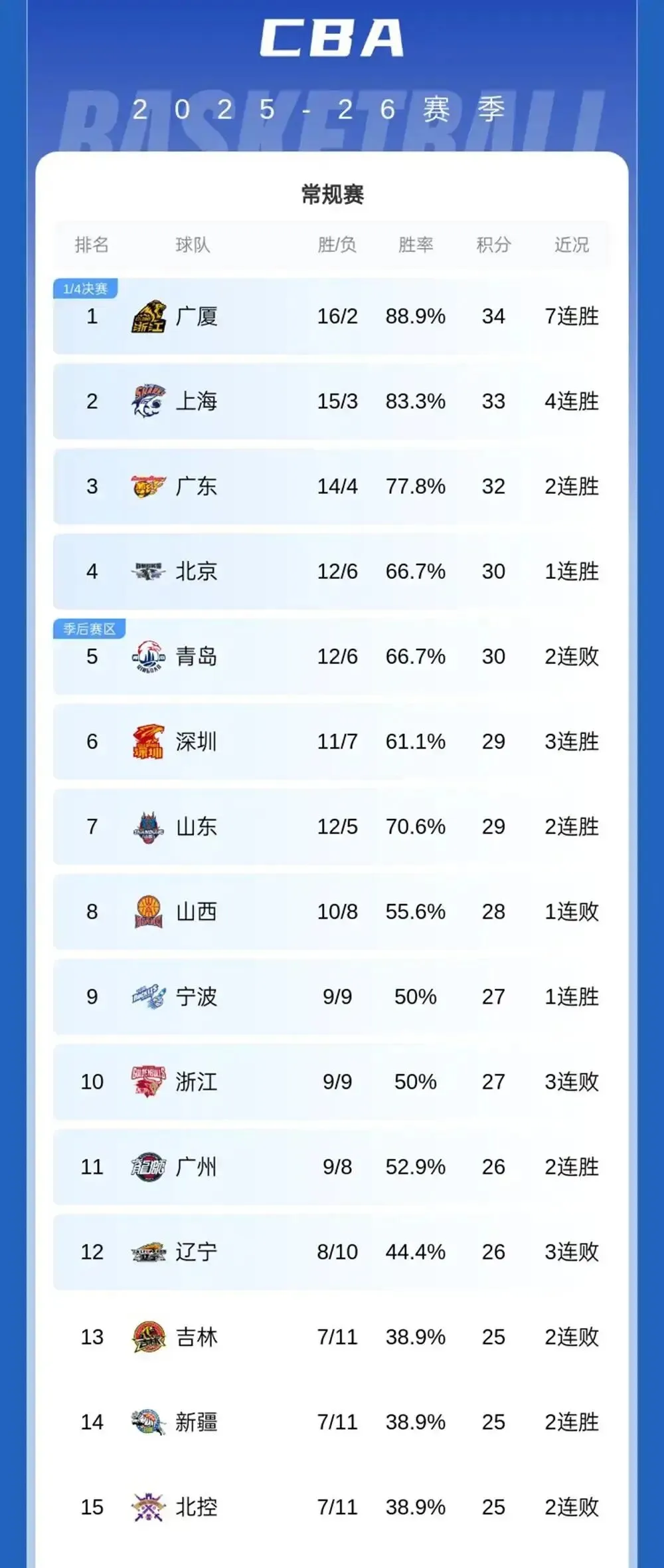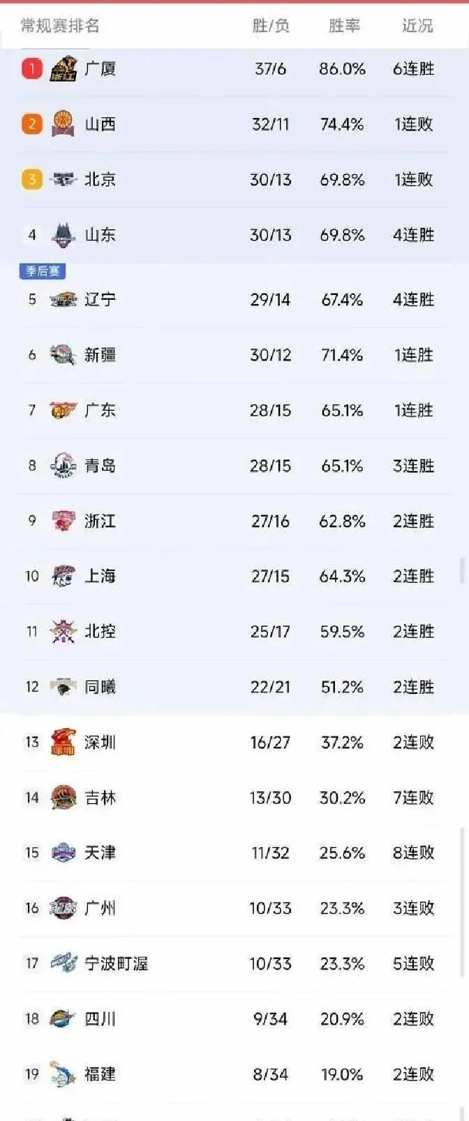 看看现在的最新积分榜,真的太刺激了。广厦一骑绝尘独一档领跑,上海和广东紧咬不放,这第一梯队的争夺已经白热化。