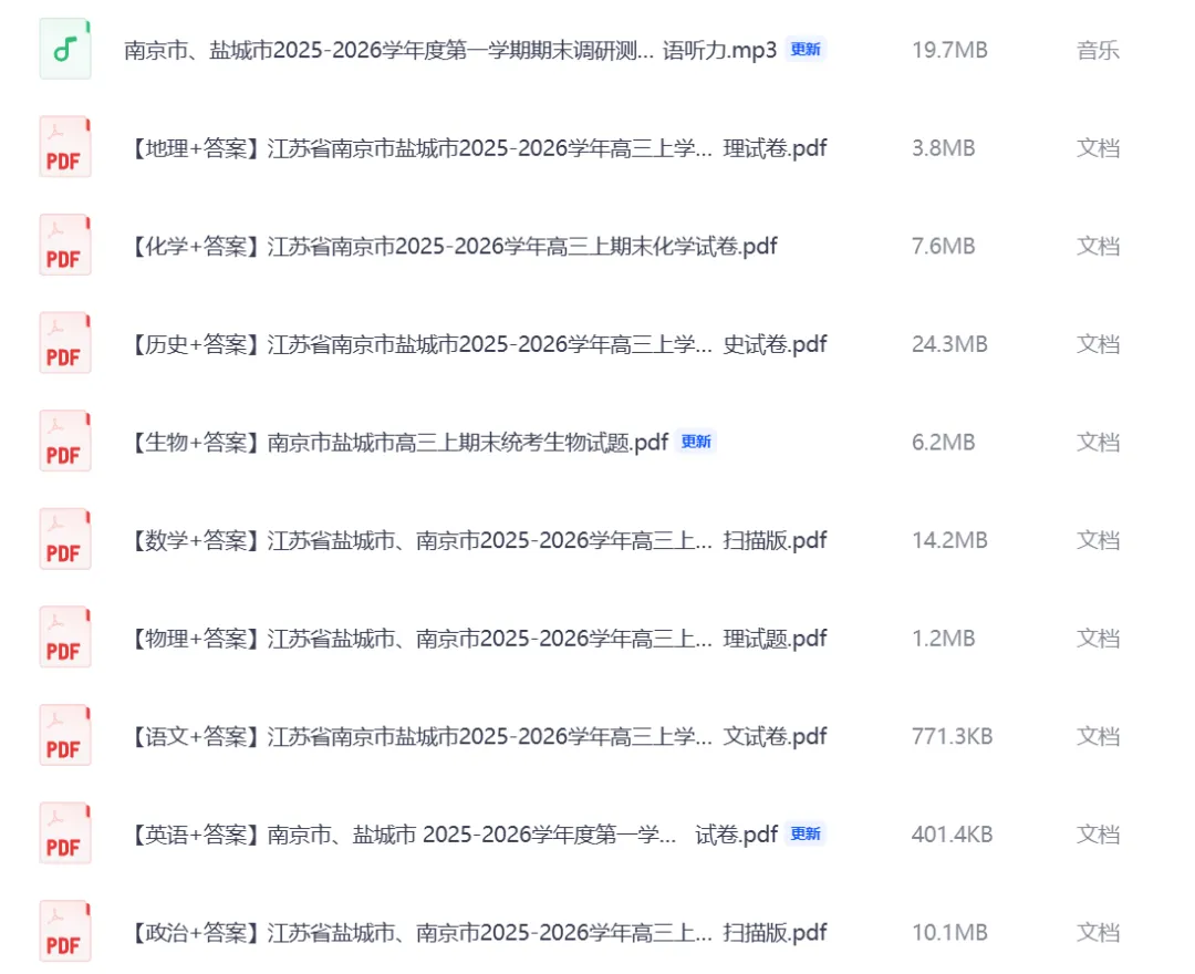 >9科全!2026南京盐城高三上期末(老一模)语文数学英语、物理化学生物、政治历史地理试卷+答案+听力