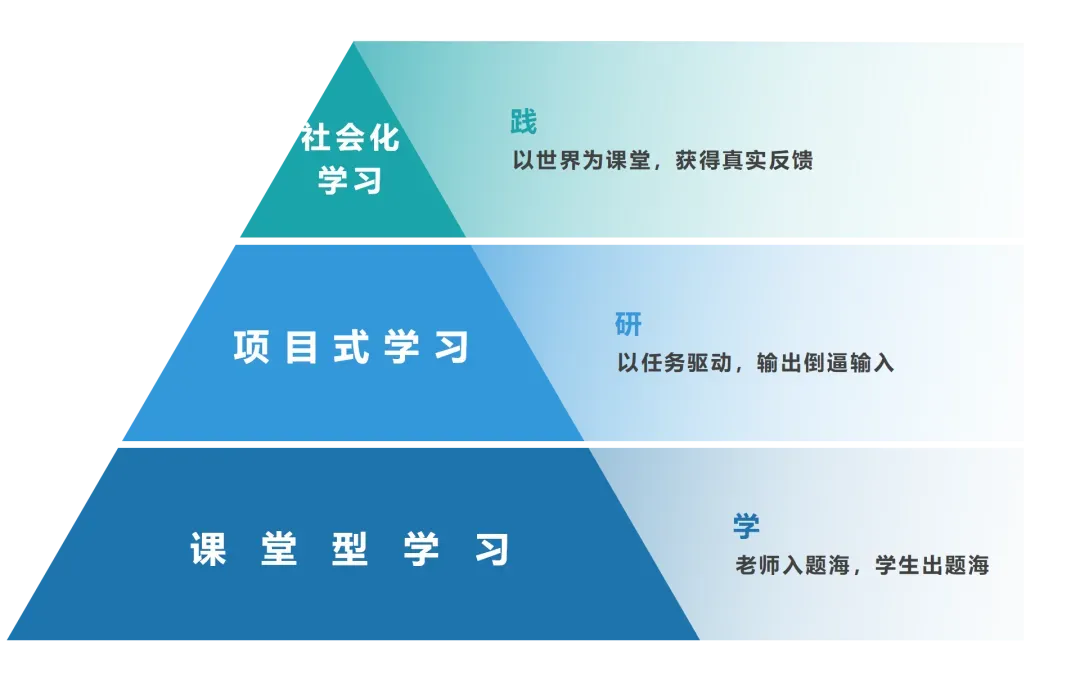 课程中心遴选出以真实情境为基点,适配本土学生成长和发展的国际教育理念一大概念教学,并以此为纽带,将课堂式学习、项目式学习和社会化学习三者有机融合,为学生量身打造通向全球顶尖高校的培养路径,全面提升学生素养,融通世界。