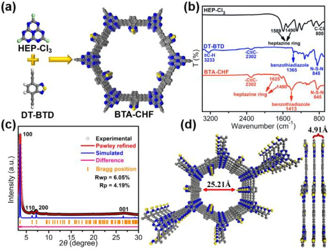 图2 | BTA‑CHF的合成与结构表征。(a) BTA‑CHF合成示意图。(b) HEP‑Cl、DT‑BTD和BTA‑CHF的FT‑IR光谱。(c) BTA‑CHF的实验和精修PXRD曲线。(d) 基于AA堆积的模拟BTA‑CHF模型的俯视图和侧视图。(对于FT‑IR和PXRD,每个样品测量了三次)。