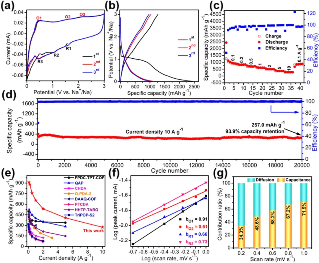 图3 | BTA‑CHF的一系列电化学性能:(a) 扫描速率为1.0 mV s⁻¹时最初三个循环的CV曲线。(b) 电流密度为0.1 A g⁻¹时最初三个循环的放电/充电曲线。(c) 电流密度在0.1至10.0 A g⁻¹范围内的倍率性能。(d) 电流密度为10.0 A g⁻¹时的长循环性能。(e) BTA‑CHF与依赖于氧化还原活性位点的其他电极的性能比较。(f) 两个代表性阴极/阳极峰对(1.60/0.43和1.05/1.61 V)的b值。(g) 扫描速率在0.2至1.0 mV s⁻¹范围内电容主导扩散过程的贡献比例。(这些电化学性能均通过三次平行实验测试以排除异常值)。