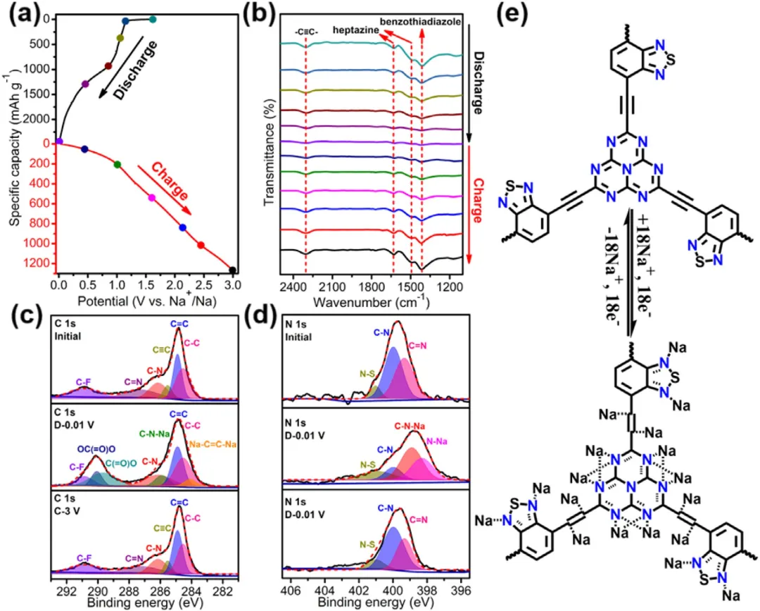 图4 | 通过结构演化研究BTA‑CHF的钠化/脱钠机理:(a) BTA‑CHF在电流密度为0.1 A g⁻¹时的放电和充电曲线。(b) 在(a)中的放电/充电过程中,不同电压点记录的FT‑IR光谱。(c,d) 不同钠化/脱钠状态下BTA‑CHF的C 1s和N 1s XPS谱图。(e) BTA‑CHF钠化/脱钠机理示意图。(机理研究的FTIR和XPS表征来自两个处于相同状态的电池)。