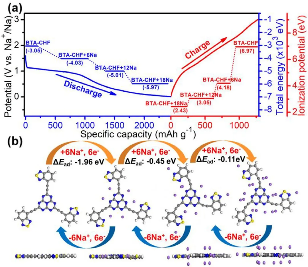 图5 | BTA‑CHF钠化/脱钠机理的理论研究:(a) BTA‑CHF提出的钠化/脱钠路径。(b) 钠化/脱钠过程中BTA‑CHF的结构评估。