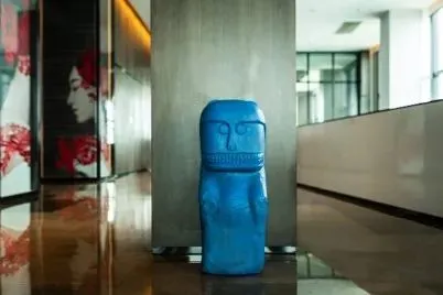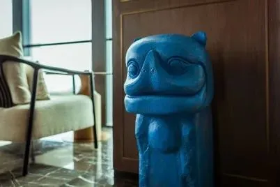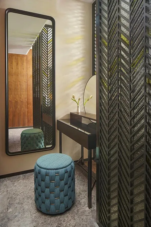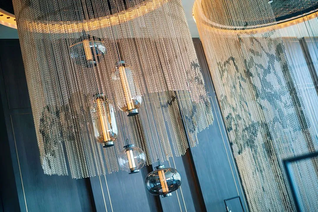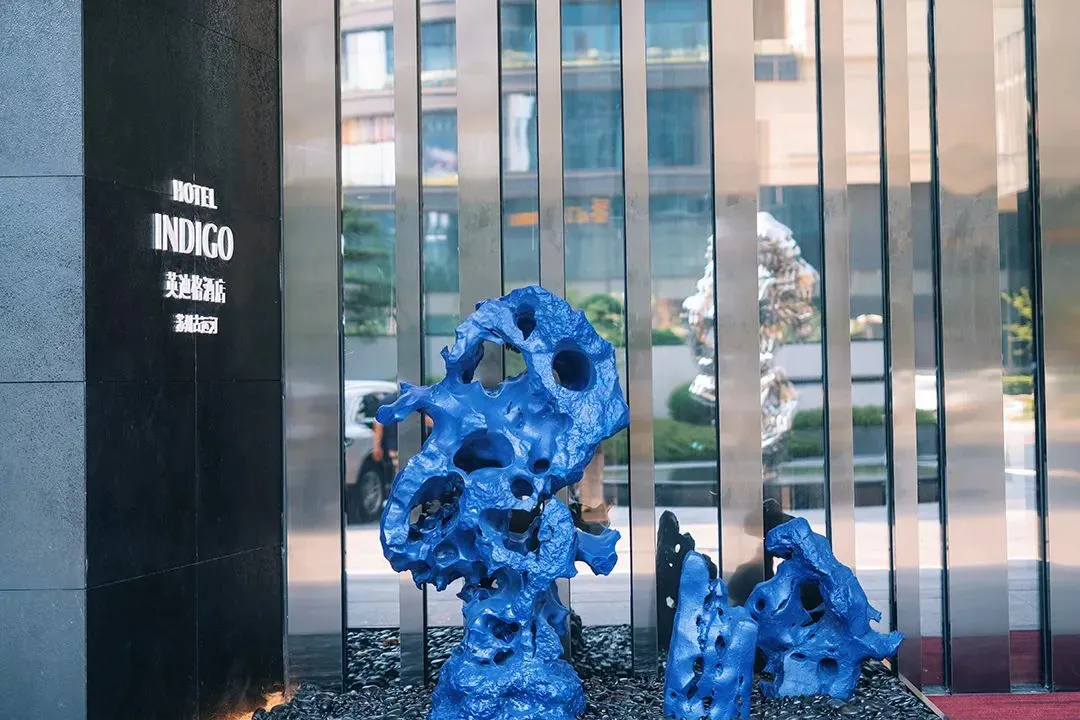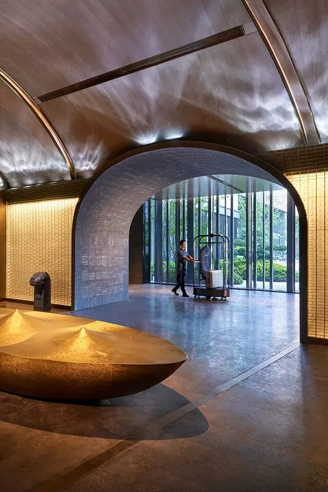 一楼为酒店抵达区,你可以看到苏州园林中常见的“太湖石”,以新面貌回归:银色雕塑+蓝色粉饰,被置于酒店入口前;室内更有感觉了,从古诗《枫桥夜泊》中汲取创意,将空间设计成桥洞模样,走在其中,如同游船。