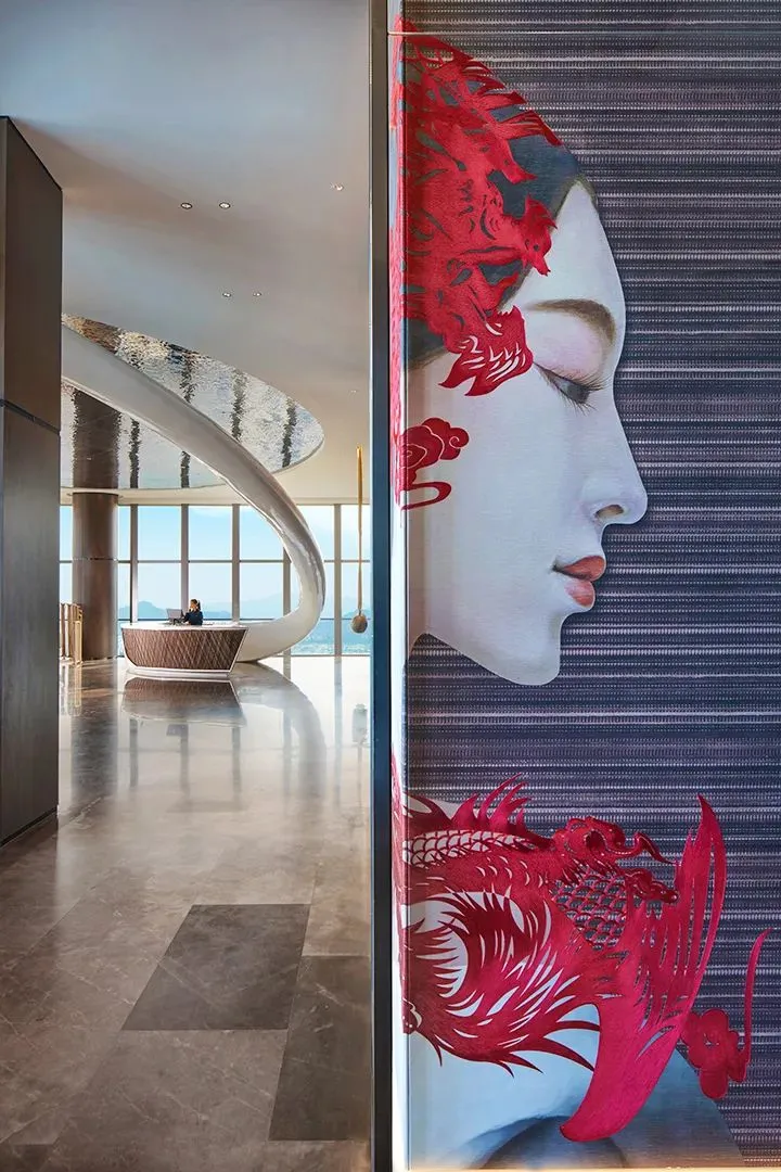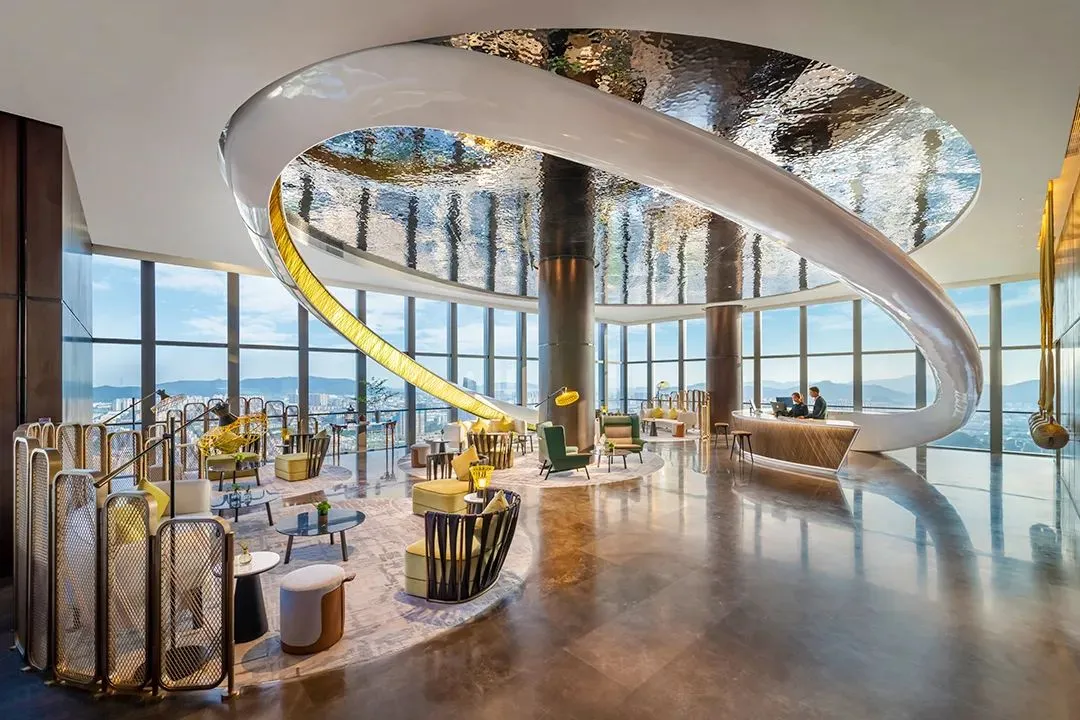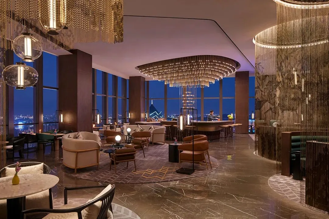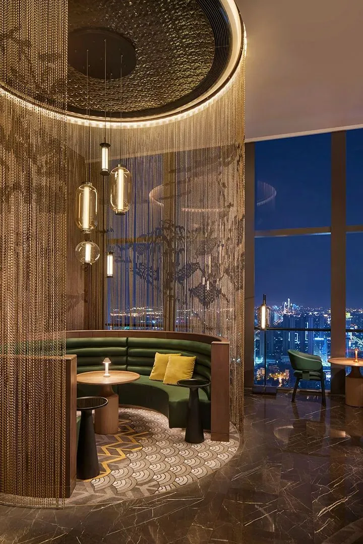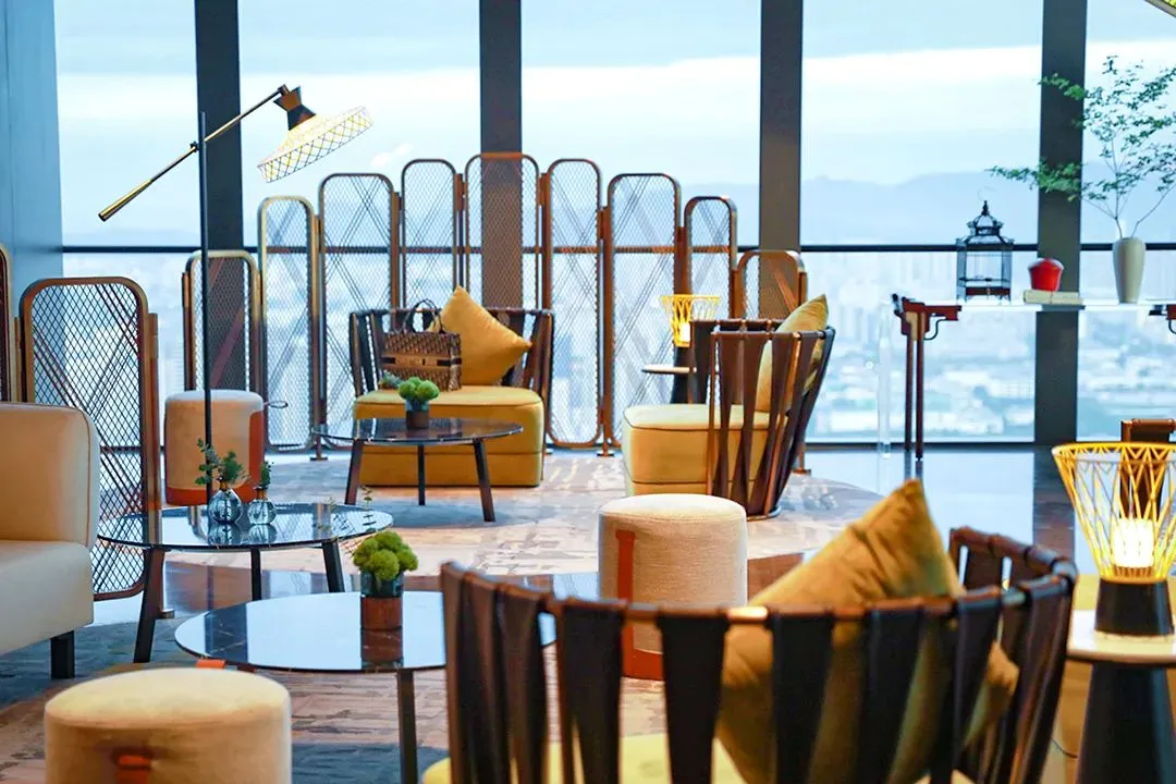 乘电梯抵达顶楼46F,能俯瞰全城的天际大堂,十足圈粉。环目整个空间,色调是精致的黑、点睛的红或黄,示意江南雅致意境。