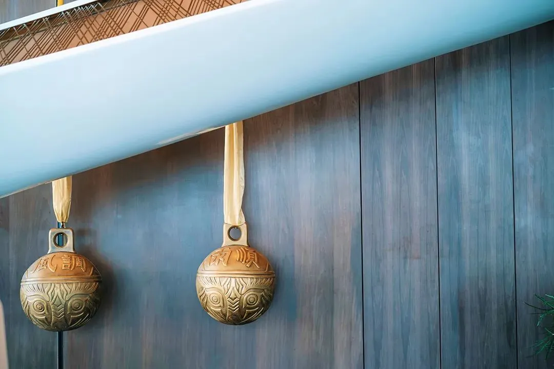 酒店前台的墙上,挂着5只寒山寺的铜铃,