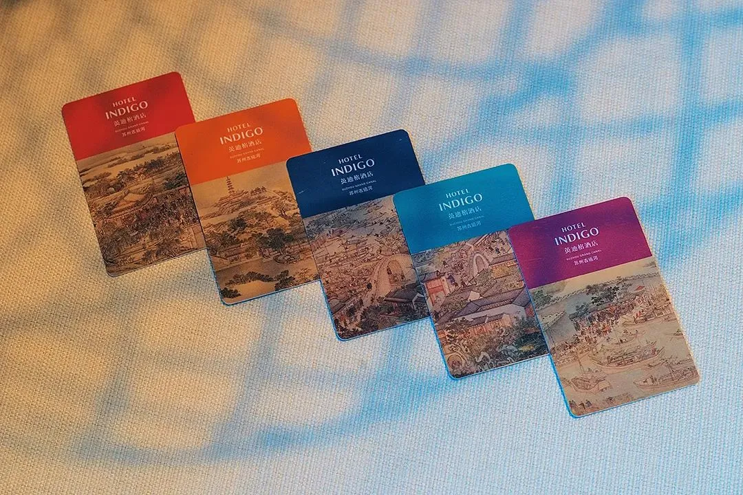 尤其特别的是,前台摆放着写了“倷好(nei第二声 hai第四声)”二字的折扇,办理入住时,工作人员也会说上一句,软糯软糯的;墙上还挂着”风调雨顺“的铜铃,寓意寒山闻钟…姑苏的氛围感更强烈了。拿到酒店精心设计的房卡后,乘电梯抵达客房。