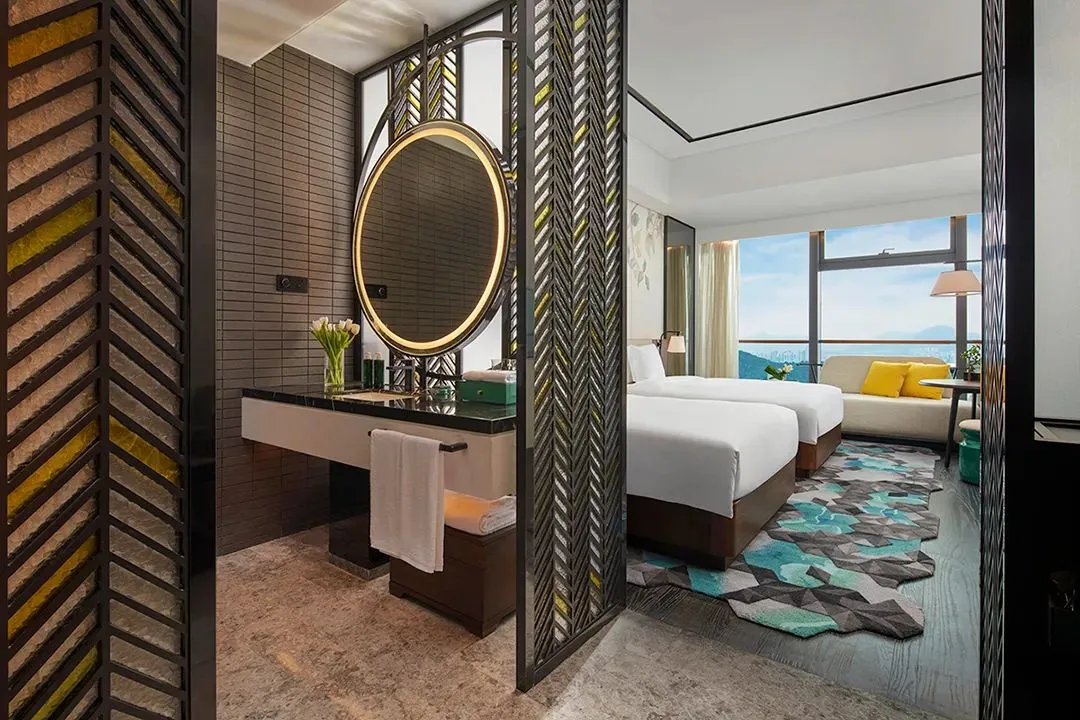 276间风格独特的景观客房和套房,位居32-44层,37㎡起,落地窗的设计让视野变得更开阔。布局虽然简约,但以园林为主题的客房,细节可圈可点,比如:叶纹彩色玻璃屏风、床头背景墙上的苏绣牡丹。