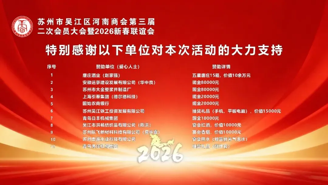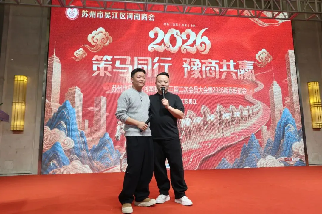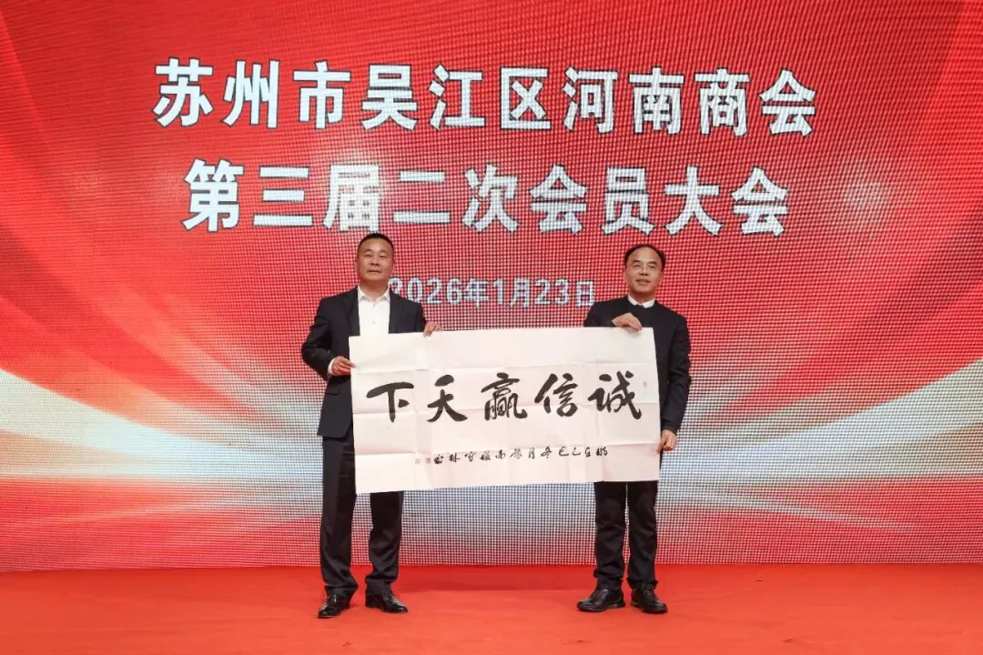 岁聿云暮,龙章载誉归;春祺启元,骏马踏春来!1月23日,苏州市吴江区河南商会第三届二次会员大会暨2026新春联谊会在苏州吴江盛大举行。300余名商会会员及家属齐聚一堂,更有来自苏州市吴江区、盛泽镇、河南省固始县、安徽省六安市叶集区、湖北省黄冈市龙感湖管理区等政府职能部门领导,兄弟商( 协 )会嘉宾,固始农商行、叶集农商行 、农业银行盛泽支行、苏州农商行盛泽支行等15家金融机构代表,安徽运蓼建设发展有限公司、苏州市大金整浆并制造厂、苏州吴江铁工投资发展有限公司等10余家特邀企业嘉宾共赴盛会。其中,固始县委常委、统战部部长胡冰,固始县政协副主席、工商联主席杨云霄,固始县人社局局长熊德华,吴江区工商联副主席王利新,龙感湖管理区党工委书记於春明,叶集区人民政府副区长刘美胜,龙感湖管理区工业园区管委会主任宛石斌,盛泽镇总商会秘书长杜佳鸣等领导亲临现场指导。星光与笑容相映,乡情与友情相融,全体来宾共叙乡情友谊,共商发展大计,在辞旧迎新的美好氛围中,共同见证这场凝聚力量、满载希望的年度盛典。第一阶段,第三届二次会员大会严格按照既定议程有序推进,各项环节务实高效、意义深远,为商会新一年发展奠定坚实基础。商会秘书长丁伯祥率先登台,详细宣读《河南商会2025年度工作报告》。报告全面回顾了2025年商会在凝聚豫商力量、搭建交流平台、服务会员企业、回馈家乡与社会等方面的重点工作与丰硕成果,既总结了经验与亮点,也明确了未来的发展方向与核心任务,让全体会员对商会发展有了清晰全面的认知。随后,商会执行会长齐光亮发布《河南商会2025年度财务收支报告》,以公开、透明的态度,列明年度收入及资金使用情况,确保每一笔款项去向清晰、用途合规,主动接受全体会员的监督与审议,赢得了现场会员的广泛认可。现场隆重宣读《河南商会2026年新增副会长单位、理事单位建议名单》,经全体会员审议通过后,授牌仪式正式启动。商会理事长张家林、监事长易承喜分别为新增理事单位授牌。崭新的牌匾承载着责任与期望,新成员的加入为商会注入了新鲜血液,进一步壮大了豫商发展合力,为商会平台建设与资源整合增添了新动能。合作共赢是豫商刻在骨子里的优良传统,更是商会“抱团取暖、携手前行”的核心追求!商会与盛泽镇苏美盛大酒店,在合作一年的基础上,延续缔结2026年度战略伙伴关系!苏美盛大酒店在吴江盛泽深耕多年,以中档亲民的定位、贴心尽责的服务赢得了广大顾客的口碑,此次牵手,正是要搭建起“会员受益、商家赋能”的共赢平台:今后,无论是商会组织活动、会员商务接待,还是家人朋友小聚,优先选择苏美盛酒店,用实际行动支持合作伙伴的发展;同时,苏美盛酒店也将为商会会员提供专属的优质服务与便捷保障,让每一位家人都能感受到“自家定点场所”的贴心与实惠。情系乡村振兴,爱暖美丽乡村。多年来,商会始终牢记社会责任,积极响应“万企兴万村” 行动号召,以实际行动投身社会公益,持续为改善乡村人居环境、助力乡村振兴事业添砖加瓦,用豫商的责任与担当诠释着合作共赢之外的大爱与坚守。今天,我们再次相聚于此,举行爱心捐款仪式,这既是商会对乡村振兴事业的持续助力,更是每一位会员企业回馈社会的真情表达。点滴爱心,汇聚成河;涓涓细流,可润心田。“万企兴万村”公益捐款仪式温情举行,商会党支部书记陈传祥与盛泽镇圣塘村党委书记张健荣共同参与。商会以实际行动践行社会责任,助力乡村振兴战略实施,用爱心与担当诠释了豫商的家国情怀,赢得了现场阵阵掌声。吴江区工商联副主席王利新、固始县委常委、统战部部长胡冰先后登台致辞。领导们充分肯定了苏州市吴江区河南商会近年来在团结豫商、服务地方经济、促进两地交流等方面所做的积极贡献,同时结合区域发展规划与营商环境优化方向,为商会未来发展提出了宝贵建议与明确期望,鼓励全体豫商继续发扬中原儿女淳朴坚韧、奋进拼搏的精神,在吴江这片热土上携手并肩、再创佳绩。领导的殷切寄语让现场嘉宾与会员备受鼓舞,进一步凝聚了发展共识。值得一提的是,固始作为闻名遐迩的书法之乡,胡冰部长在致辞结束后,代表固始县委、县政府向商会赠送了一幅饱含深情的书法作品——《诚信赢天下》。笔墨酣畅淋漓,字迹刚劲有力,既彰显了书法之乡的文化底蕴,更寄托了家乡政府对在外豫商坚守诚信之本、勇闯市场、共赢发展的美好祝福 。会员大会圆满结束后,2026 新春联谊会在热烈的氛围中精彩启幕。商会会长陈洪身着正装登台,以“骏马踏春至,乡情聚满堂”为引,向莅临现场的各级领导、兄弟商(协)会代表、合作银行嘉宾及全体会员与家属,致以最热烈的欢迎和最诚挚的新春祝福。展望充满希望的马年,陈洪会长郑重表态:商会将持续深化政企对接、拓宽资源共享、激活金融赋能,与全体同仁一道在创业路上奔腾不息,在服务区域经济中续写华章。文艺表演环节亮点纷呈、气氛热烈。开场女歌手的激情演唱瞬间点燃现场氛围;吴江瑞仟佳纺织有限公司付少清带来《等待》、《牡丹之歌》,歌声悠扬婉转,比肩专业歌手;海曼新材料(江苏)有限公司陈家传、詹海飞合唱《水手》,唱出了奋斗者的执着与担当;商会财税顾问凌齐齐献唱《一生不变》,深情款款打动人心;主