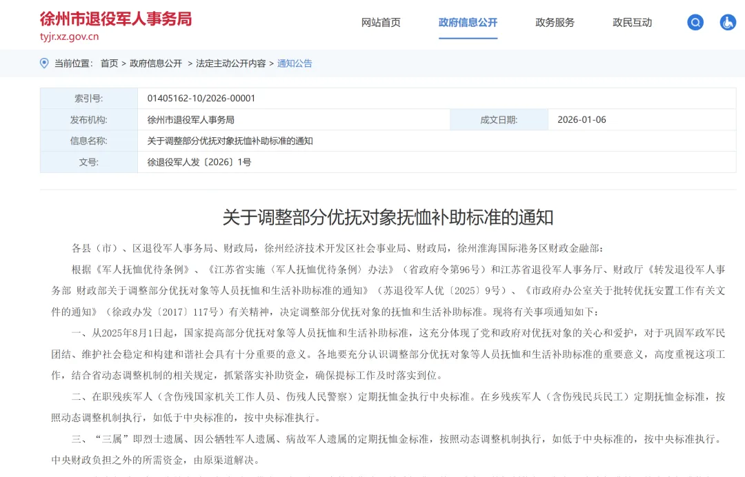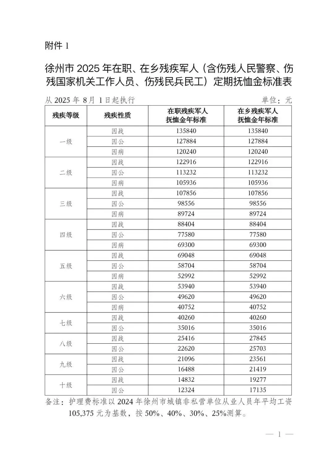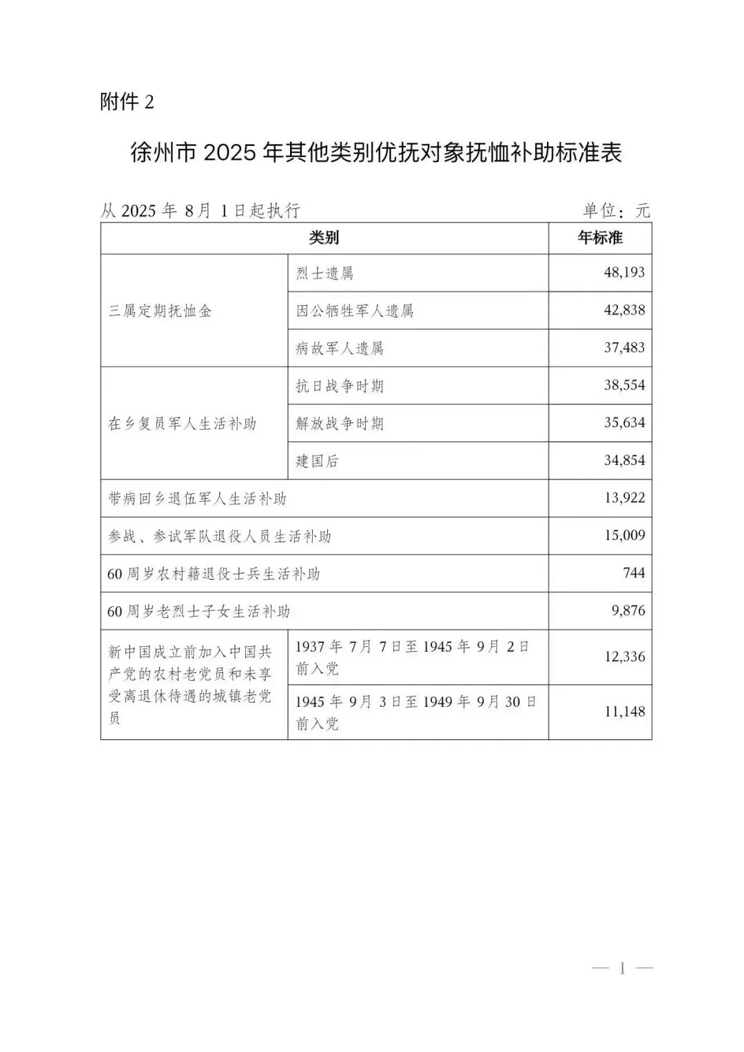 根据《军人抚恤优待条例》、《江苏省实施〈军人抚恤优待条例〉办法》(省政府令第96号)和江苏省退役军人事务厅、财政厅《转发退役军人事务部 财政部关于调整部分优抚对象等人员抚恤和生活补助标准的通知》(苏退役军人优〔2025〕9号)、《市政府办公室关于批转优抚安置工作有关文件的通知》(徐政办发〔2017〕117号)有关精神,决定调整部分优抚对象的抚恤和生活补助标准。现将有关事项通知如下:一、从2025年8月1日起,国家提高部分优抚对象等人员抚恤和生活补助标准,这充分体现了党和政府对优抚对象的关心和爱护,对于巩固军政军民团结、维护社会稳定和构建和谐社会具有十分重要的意义。各地要充分认识调整部分优抚对象等人员抚恤和生活补助标准的重要意义,高度重视这项工作,结合省动态调整机制的相关规定,抓紧落实补助资金,确保提标工作及时落实到位。二、在职残疾军人(含伤残国家机关工作人员、伤残人民警察)定期抚恤金执行中央标准。在乡残疾军人(含伤残民兵民工)定期抚恤金标准,按照动态调整机制执行,如低于中央标准的,按中央标准执行。三、“三属”即烈士遗属、因公牺牲军人遗属、病故军人遗属的定期抚恤金标准,按照动态调整机制执行,如低于中央标准的,按中央标准执行。中央财政负担之外的所需资金,由原渠道解决。四、在乡复员军人、参战参试退役人员、带病回乡退伍军人的定期生活补助标准,按照动态调整机制执行,如低于中央标准的,按中央标准执行。中央财政负担之外的所需资金,由原渠道解决。五、对居住在农村和城镇无工作单位、18岁之前没有享受过定期抚恤金且年满60周岁的烈士子女(含建国前错杀后被平反人员的子女)生活补助标准为每人每年9,876元。我省增发部分所需资金,由省级财政与县(市)、区级财政各承担50%。六、对从1954年11月1日试行义务兵役制后,至《退役士兵安置条例》实施前入伍、年龄在60周岁以上(含60周岁)、未享受到国家定期抚恤补助的农村籍退役士兵的老年生活补助,调整为每服一年义务兵役每人每年补助744元,中央财政负担之外所需资金,由省级财政与县(市)、区级财政各承担50%。七、提高新中国成立前加入中国共产党的农村老党员和未享受离退休待遇的城镇老党员的生活补助标准,按中央调整后的补贴标准执行。已享受优抚对象抚恤补助的老党员不执行上述补贴标准,仍按省定标准每人每月100元标准发给生活补助。中央财政负担之外所需资金,由省级财政承担。八、抚恤优待对象具有双重或多重身份的,定期抚恤金或者补助金应当享受其中的最高标准。九、各级有关部门要加强对部分优抚对象抚恤补助专项资金的管理,进一步优化工作方式,夯实工作基础,加大督查力度,扎实做好部分优抚对象年度确认工作,确保抚恤补助等资金及时、准确、足额发放到部分优抚对象等人员手中。十、此次调整部分优抚对象的抚恤和生活补助标准从2025年8月1日起执行。1.徐州市2025年在职、在乡残疾军人(含伤残人民警察、伤残国家机关工作人员、伤残民兵民工)定期抚恤金标准表2.徐州市2025年其他类别优抚对象抚恤补助标准表