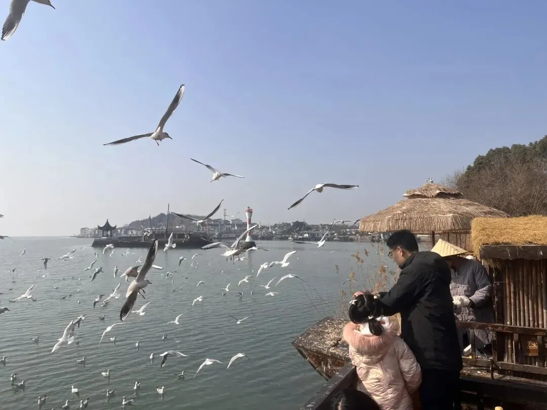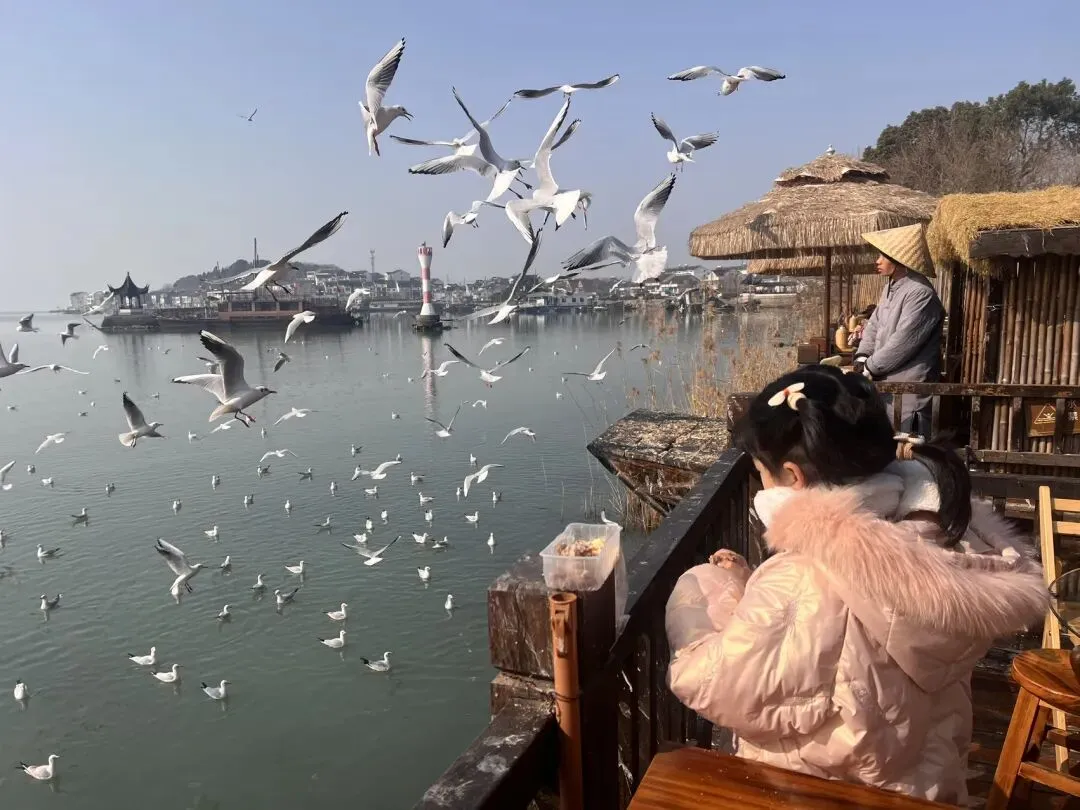 到了太湖边上,大家不断投喂食物,海鸥欢快地飞翔,发出他们的歌声。湖边有风稍微有点冷,我们到禅寺里找了茶座休息观赏。妹妹不停歇地给海鸥投喂了两波美食,沉浸其中,感觉不过瘾。