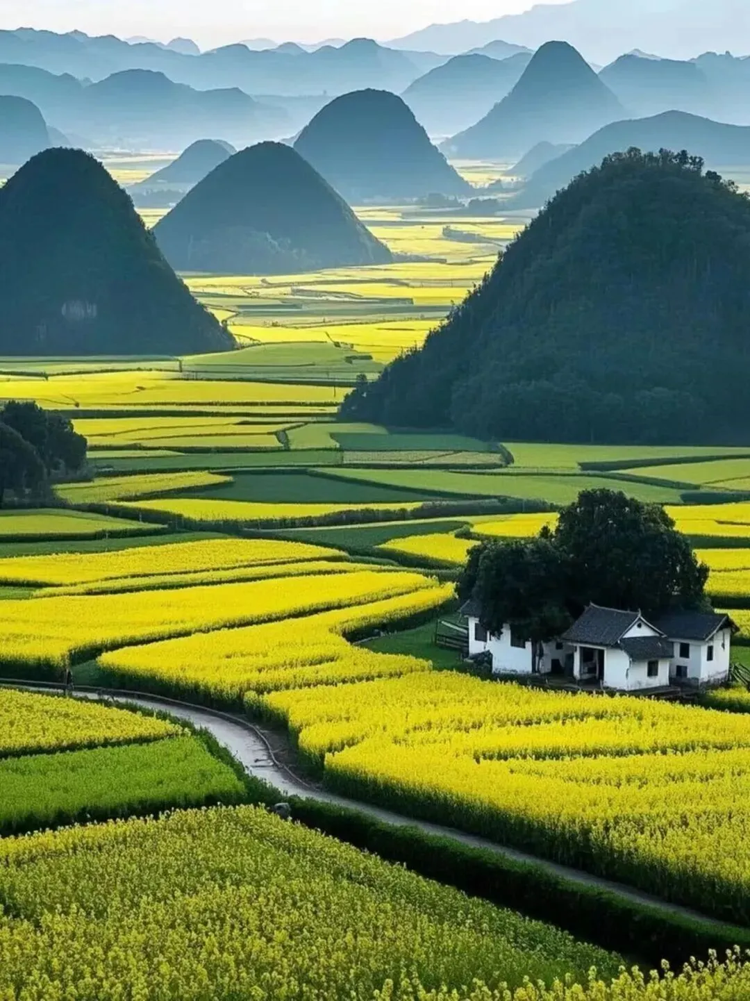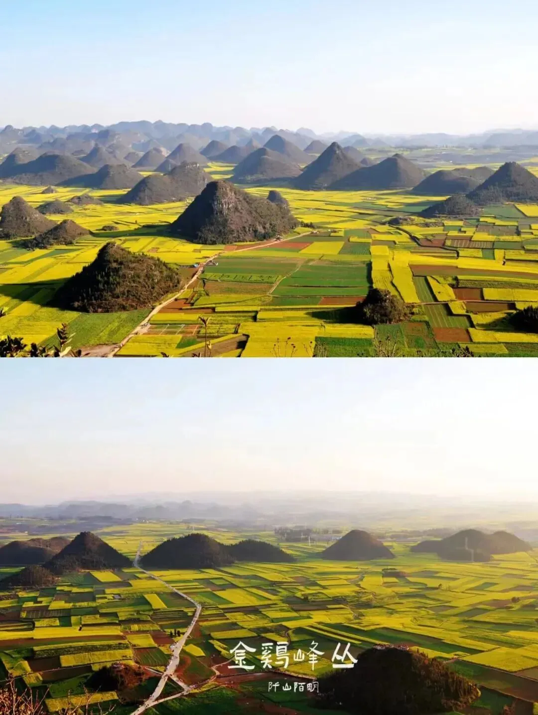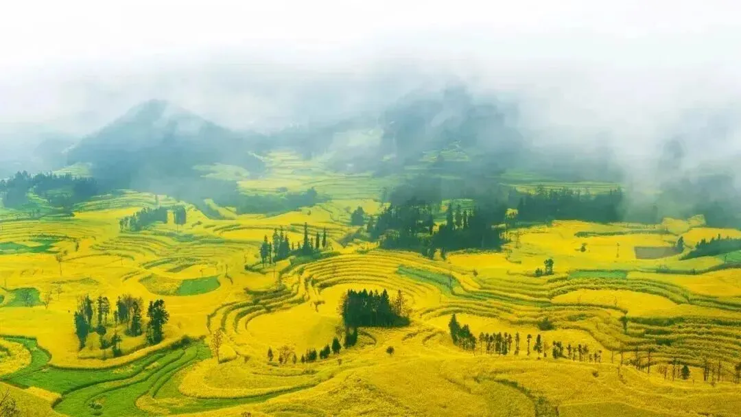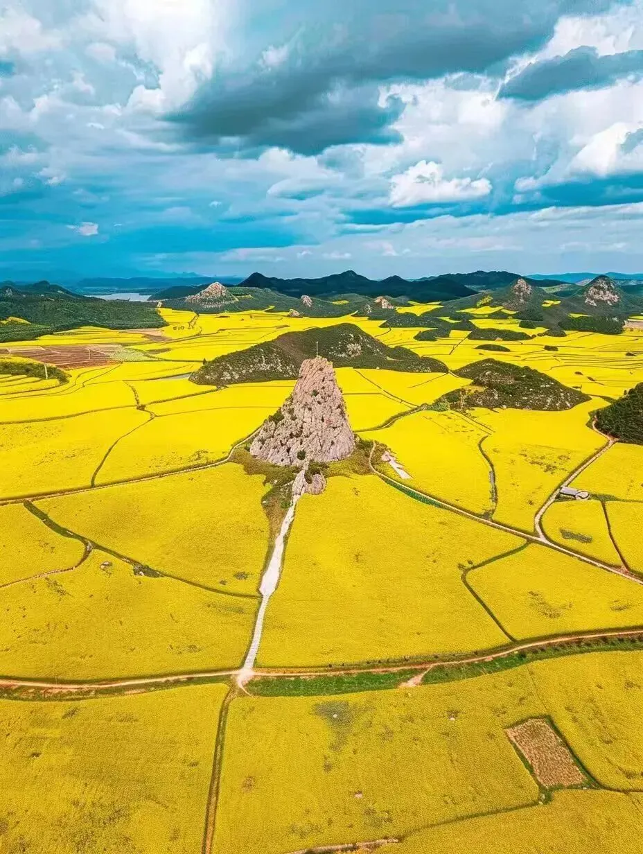 行程描述:早餐后跨省前往云南罗平。这里正值油菜花海的巅峰期。上午打卡大气的[金鸡峰丛],看万座锥状山峰漂浮在金色花海中;下午观赏精致的[牛街螺丝田],看花田形成的奇特圈状纹理。游览结束后,前往广南县(普者黑附近)入住。