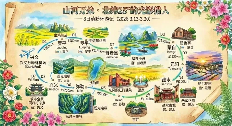 专为"兴义进出"定制的8日史诗级路线。不走回头路,一次性将【罗平金浪】、 【元阳梯田】、【普者黑水乡】、 【建水古韵】、 【弥勒摩登】、 【兴义峡谷】六重世界级喀斯特奇观/网打尽,是摄影爱好者与深度旅行家的终极梦想。