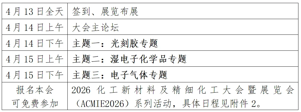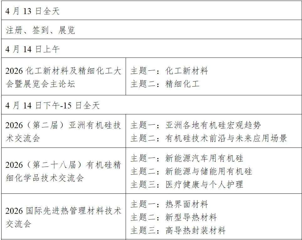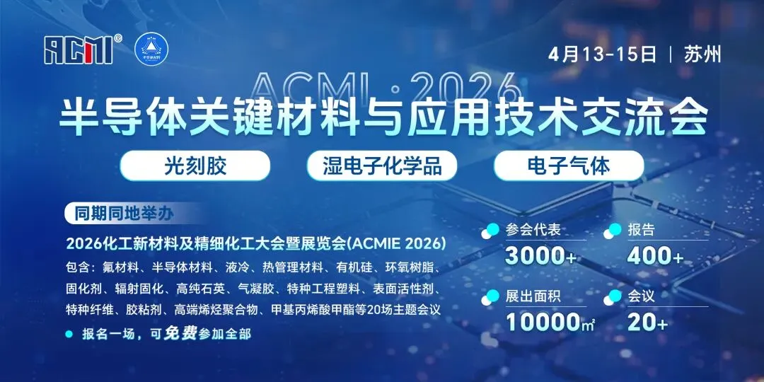 会议同期同地举办2026化工新材料及精细化工大会暨展览会(ACMIE2026),配套近20场专题技术交流活动,涵盖半导体材料、氟材料、液冷、热管理材料、有机硅、环氧树脂、固化剂、辐射固化、高纯石英、气凝胶、特种工程塑料、表面活性剂、特种纤维、胶粘剂、高端烯烃聚合物、甲基丙烯酸甲酯等重点方向。预计参会规模3000人,参加企业1500家、展示面积1万平米。具体如下: