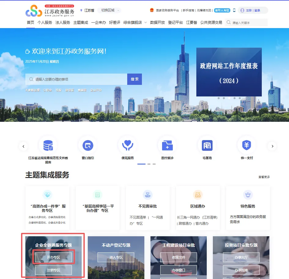 https://www.jszwfw.gov.cn/,点击“企业全链通服务专题”进入企业全链通综合服务平台。