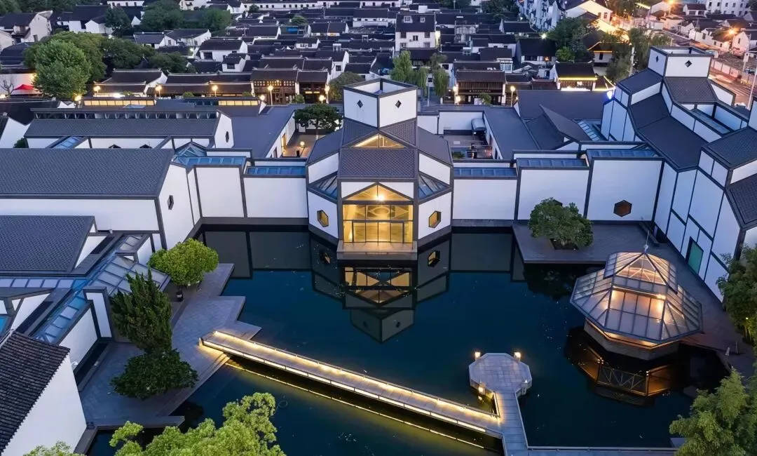 贝聿铭为苏博确立了 "不高不大不突出" 的设计原则,使这座现代建筑在古城中低调而优雅地融入周边环境。建筑外观采用粉墙黛瓦的江南传统元素,却以现代几何造型重构,错落有致的屋顶线条与玻璃幕墙相映成趣,既延续了苏州古城风貌,又彰显出鲜明的时代气息。