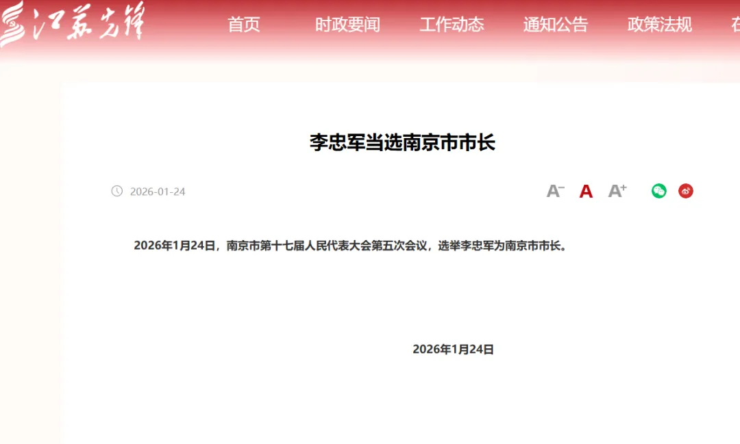 1月24日,南京市第十七届人民代表大会第五次会议,选举李忠军为南京市市长。