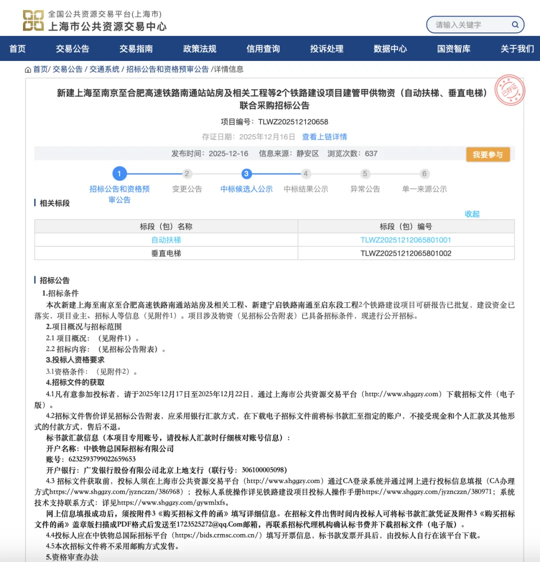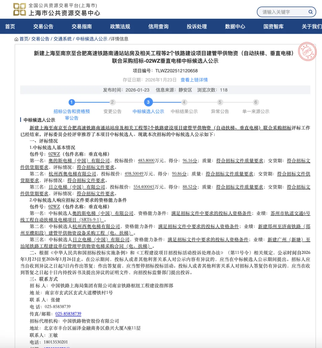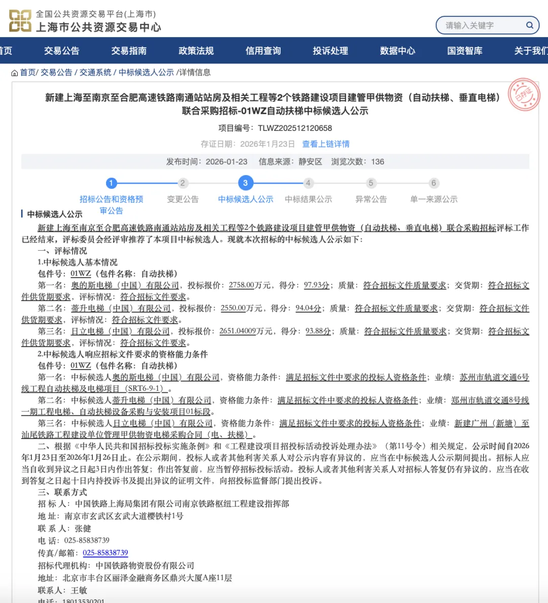 招标人:中国铁路上海局集团有限公司南京铁路枢纽工程建设指挥部项目名称:新建上海至南京至合肥高速铁路南通站站房及相关工程等2个铁路建设项目建管甲供物资(自动扶梯、垂直电梯)联合采购2025年12月16日在上海市公共资源交易中心挂网招标现在的结果已经公示出来了,由于招标人的名称和中标供应商的名称,有必要先来回顾一个2025年7月的项目招标人中国铁路上海局集团有限公司南京铁路枢纽工程建设指挥部,采购需求为13台直梯,最终奥的斯中标,成交金额339万元之前的中标与之后的中标只是因为招标人和中标人相同所以来回顾一下,至于前后有什么关联没有信息可以直接推断,如果真的有关联,也只能说明奥的斯在南京西站这个项目上的服务表现应该很好2026年1月23日两个项目的中标候选人结果公示发布项目的招标文件需要购买才能看到,通过项目的招标公告和中标候选人公示的内容,没有发现有兼投不兼中的规则,如此,奥的斯应该同时拿下扶梯和垂直梯两个标奥的斯(2758万元)得分:97.93分