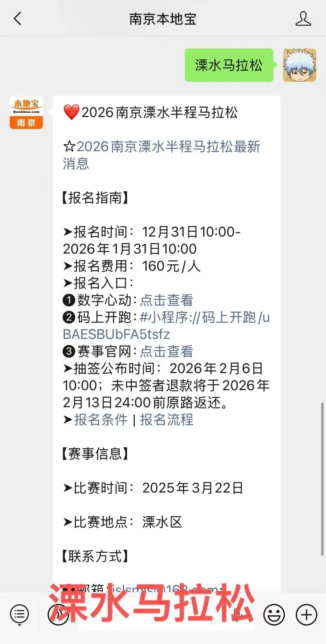 快捷报名入口:扫描下方二维码,关注【南京本地宝】,后台对话框回复【溧水马拉松】即可获取报名入口、报名费用、比赛详情等。