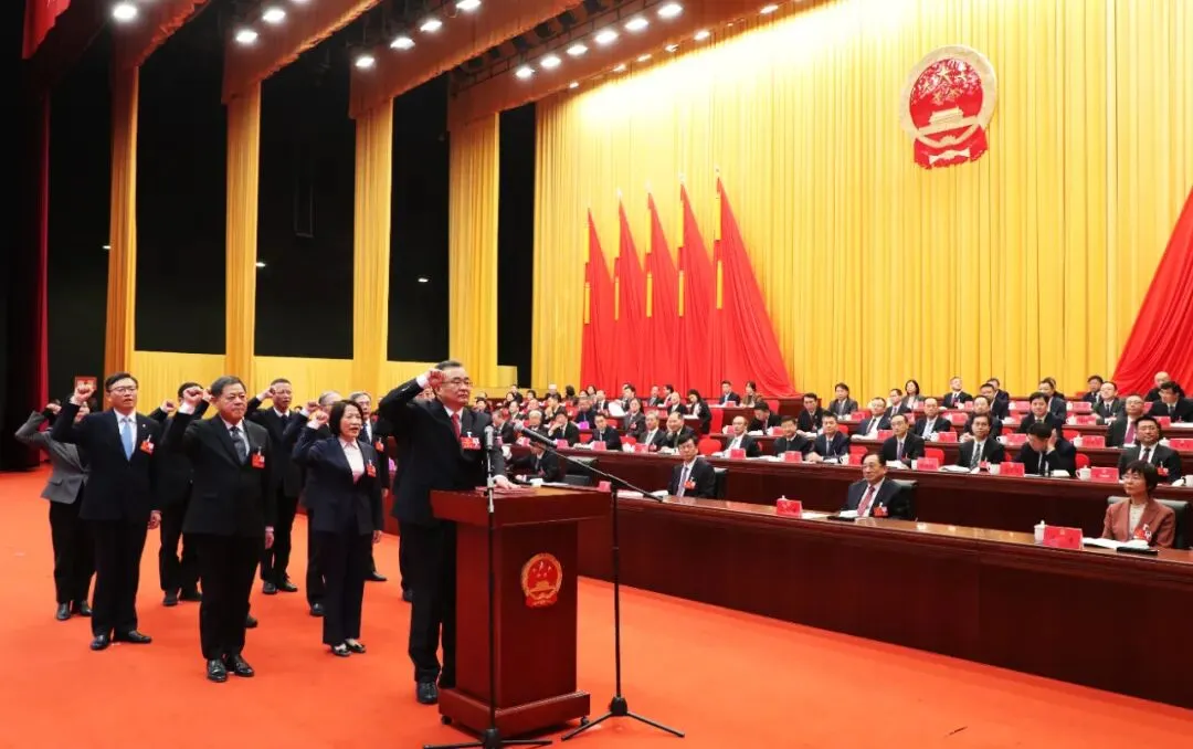 新当选的国家机关工作人员向宪法宣誓。