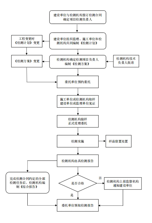 4.12.1 检测工作流程主要包括合同签订、编制计划、编制方案、见证取样送检、样品接收、检测实施、检测报告、综合报告等内容,具体如下图所示。