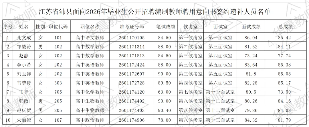 根据《江苏省沛县面向2026年毕业生公开招聘编制教师聘用意向书签约通知》要求,现将江苏省沛县面向2026年毕业生公开招聘编制教师聘用意向书递补签约人员名单(见附件)以及签约有关事项通知如下: