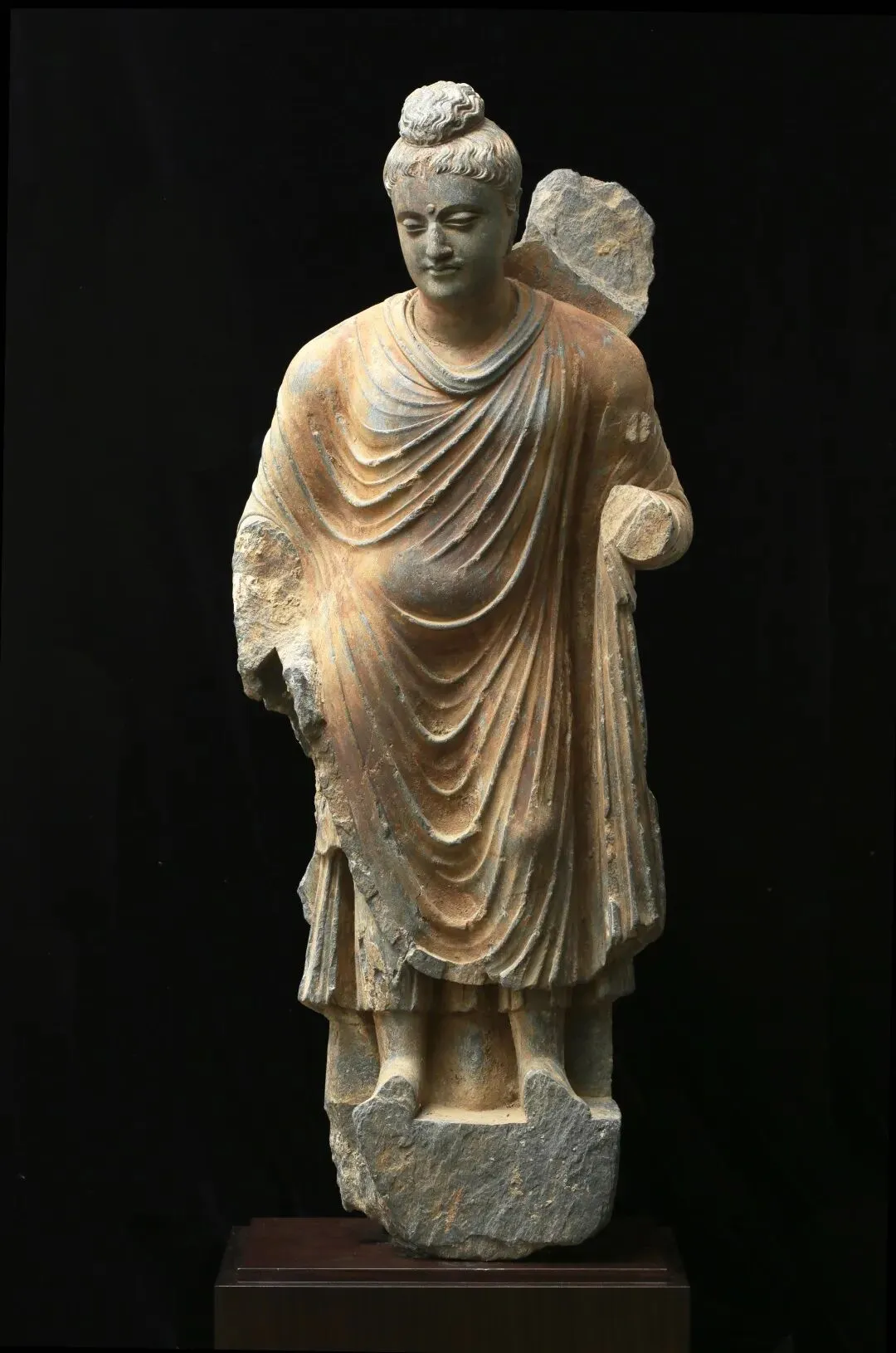犍陀罗(本意“芬芳遍地”,佛经中也译为“芳香之国”)位于巴基斯坦北部白沙瓦河谷到印度河东岸以及阿富汗喀布尔河谷东部一带。犍陀罗艺术流行于公元1至6世纪,是古希腊艺术与印度艺术相结合而形成的特殊样式,堪称古代东西方文化交融的典范。其注重对人体比例、肌肉和骨骼结构的准确描绘,造像具有强烈的真实感。其面部呈椭圆形,眉目端庄,鼻梁高挺笔直,眼窝深邃,嘴唇薄而富有线条感,头发通常为波浪式卷发,明显具有欧罗巴人面部特征,衣褶流畅而写实。同时又对人物形象进行了理想化处理,赋予造像以神圣、庄严和宁静的气质,有一种超凡脱俗的美感。