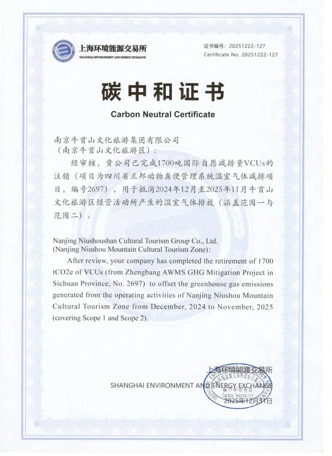 在1月13日举行的颁证仪式上,上海环境能源交易所与通标标准技术服务有限公司(SGS)分别向其颁发碳中和证书与ISO-14068国际碳中和认证,标志着该景区在碳中和管理体系上同时获得国内与国际权威机构认可。