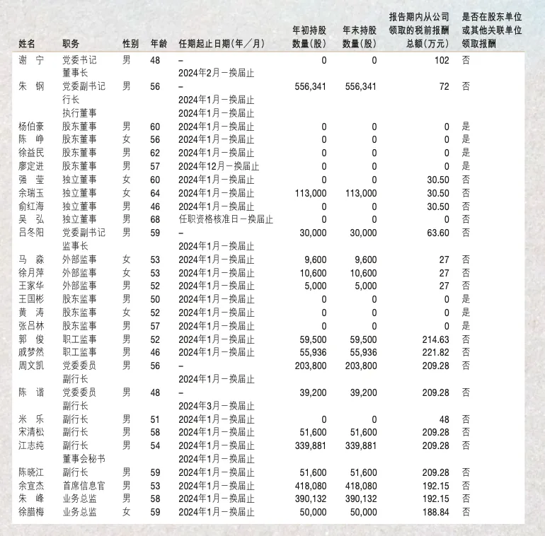2024年年报显示,党委书记、董事长谢宁2024年从公司获得的税前报酬总额为102万元,党委副书记、行长、执行董事朱钢2024年从公司获得的税前报酬总额为72万元,副行长、董事会秘书江志纯2024年从公司获得的税前报酬总额为209.28万元,以上人员均未在公司关联方获取报酬。