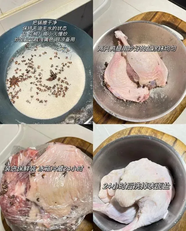 盐和花椒混合均匀 , 把鸭腿里里外外都抹到位 , 然后放冰箱冷藏。