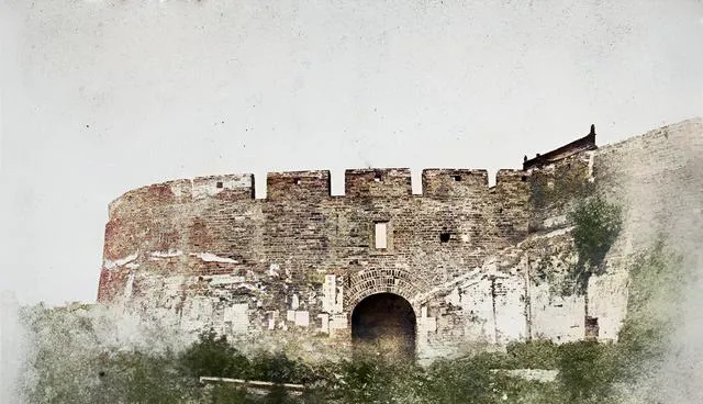 图中半圆形的石头墩子一样的城门叫晏海门,也就是老北门,条石垒得结实,城垛像锯齿一样一格一格地立着,门洞上方还贴着斑驳的告示,门外一地砖块石料,说明那时就忙着修修补补,爷爷说城墙周长九里呢,走一圈能把鞋底磨出亮光,现在人从地铁口出来两分钟就能绕半个街区,以前过门一道道,心也就稳当了。