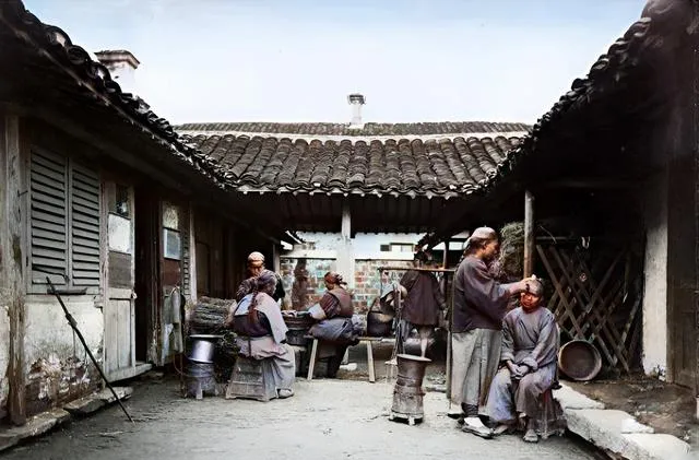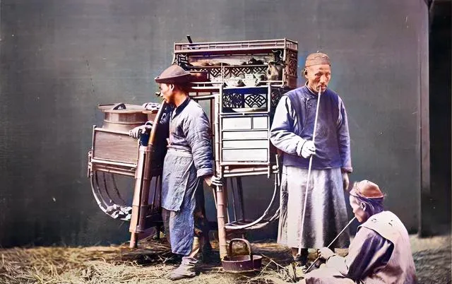 这个挑着担子的就是游街剃头匠,一头是木箱一头是炉火,凳子往院子中间一摆,顾客坐着低头,刀一“唰”贴着头皮走,旁边的人抽着旱烟等号,舅舅说剃头最怕打喷嚏,手一抖就出槽,现在理发店灯光亮堂,洗剪吹都配齐,当年的一口热水一块白毛巾,干净利落就收工了。