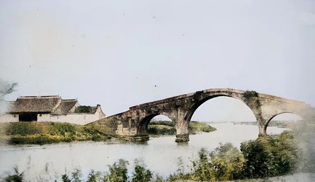 这座石拱桥一大两小三孔排开,桥背像弓,水面安稳地托着倒影,岸边房子白墙灰瓦,桥头没什么人,只有矮树和草丛,老照片里桥多,说明水系是这城的骨头,现在高架是骨头,桥成了穿缝的缝衣针,缝的是车流不是船。