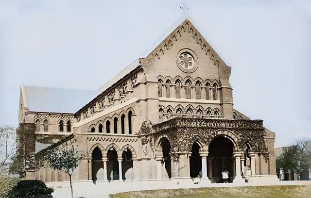 这个黄褐色的红礼拜堂尖拱窗连成一排,立面阴影里藏着雕花,门廊拱圈里像有风在转,墙根爬满了藤,远远看去又冷又庄重,我第一次见到这样的屋檐是课本上,照片里它就立在草地边,静得能听见麻雀叫。
