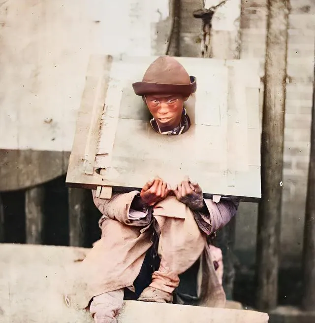 这位脖子套着方木板,叫枷号,板子边角被磨得起毛,帽子压得很低,眼睛里窝着火气,罪名写在牌子上,三日示众,想想真难受,法不该拿羞辱当手段,现在走在街头,最多看到文明宣传画,这种老照片看看就够了。