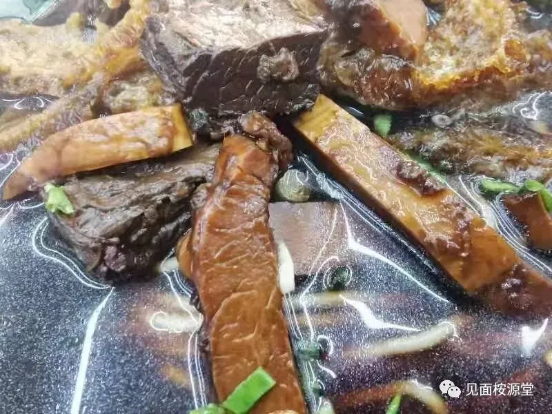 老卤:南京街头规矩的面馆,皆有味道独特的老卤,老卤汤普遍是酱色浓汤,最最崇尚的老卤,肯定不是一碗清澈见底、微黄泛油的鸡汤,而是必须“漆黑嘛糊”色泽的浓浆酱汤……非出自老卤肉的底汤不取,更有叫绝处,是谁家都互相捉摸不透的各家配料与工艺风格,就如戏里的生、旦、净、末、丑,虽然都叫“角色”,各有行腔,一家一种品格,但也泾渭分明,谁家以开水葱花猪油味精冲汤,属于严重违反南京社会“公约良俗。