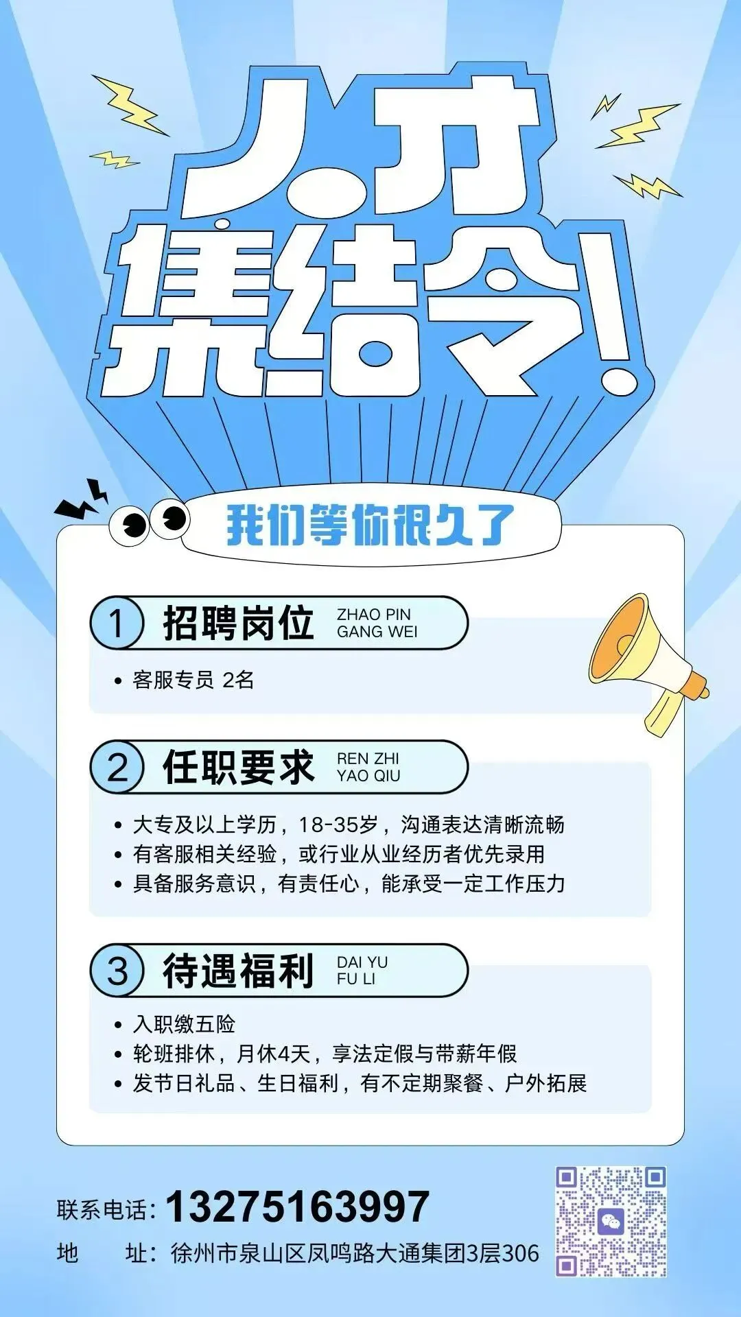 公司地址:徐州市淮海西路134号小世界大楼5楼(地铁1号线苏堤路站260米左右)交通便利。