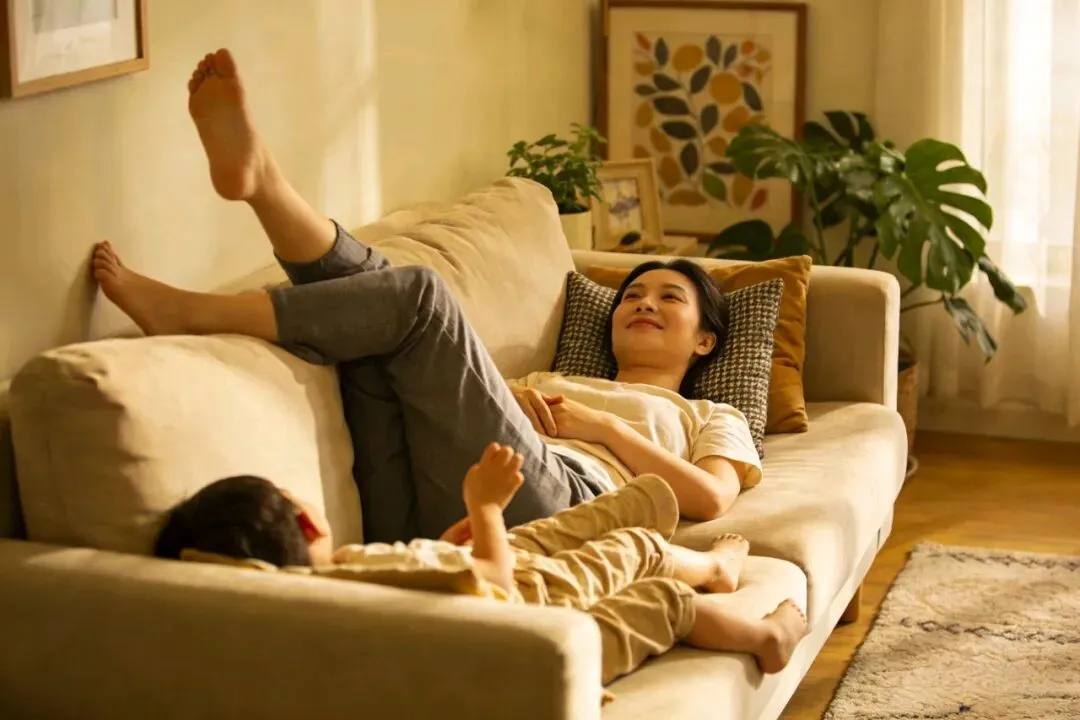 ✅ 核心休息法:回家就找舒服的地方平躺,把腿靠在沙发靠垫上,让腿部高于心脏位置,每次15分钟,既能促进血液回流,减轻腿部肿胀,又能让紧绷的肌肉放松,比单纯躺着管用10倍,带娃间隙就能做,超方便。