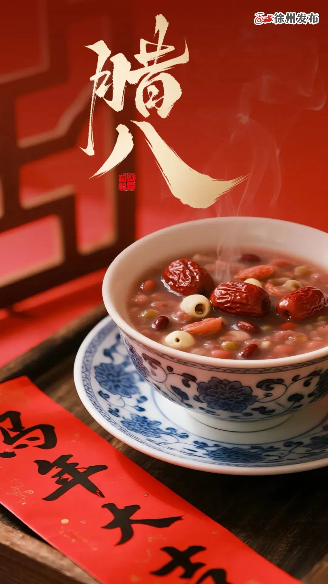 《祀记·郊特牲》说蜡祭是“岁十二月,合聚万物而索飨之也”。意思是说,腊八粥合聚八方食物,调和千灵。传统的腊八粥,用米、豆、枣、栗、莲子等七种原料,共有五种味道。明天腊八,按照传统习俗,徐州人都会做腊八粥喝。借一碗粥,祈求一年的五谷丰登、生活甜美。