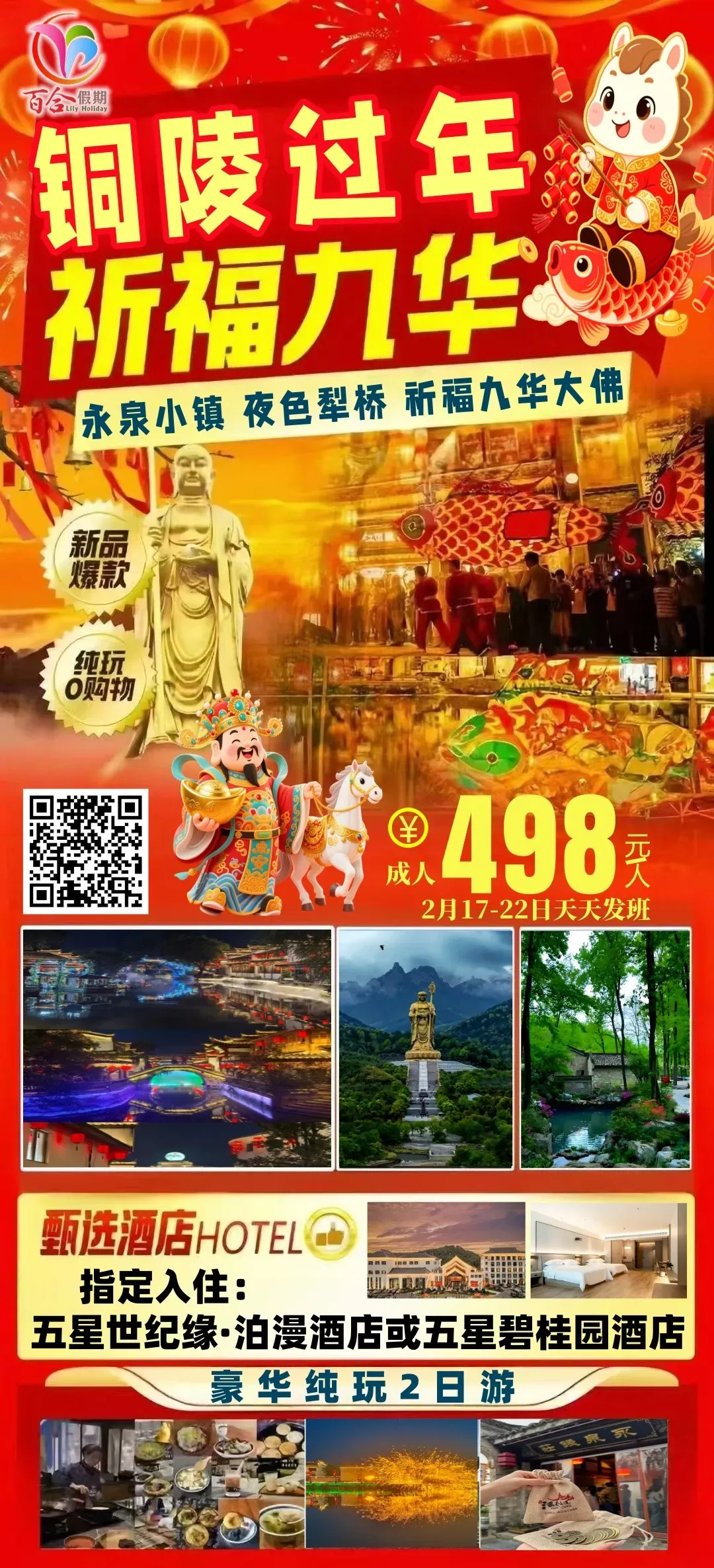 铜陵永泉12景、犁桥水镇夜景秀、九华大佛祈福、五星住宿、