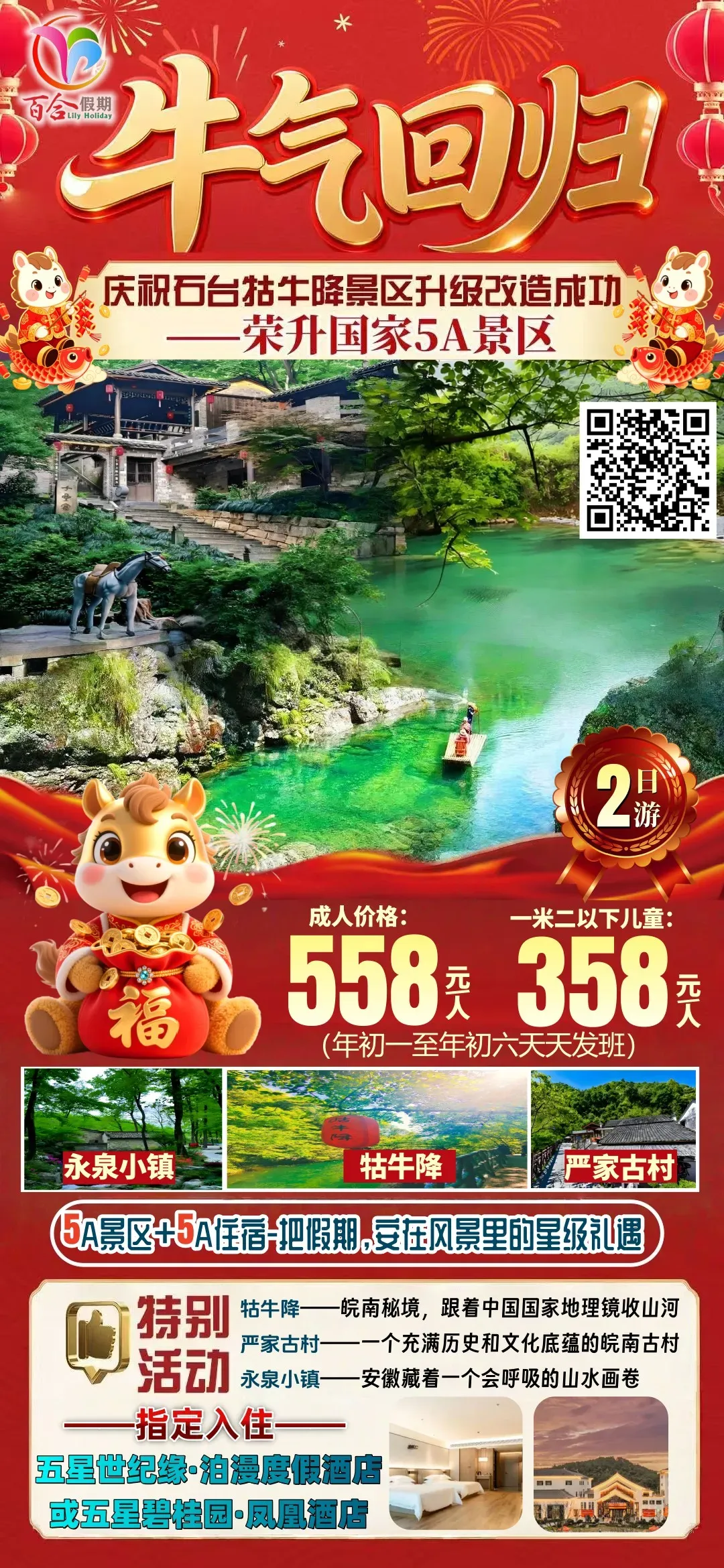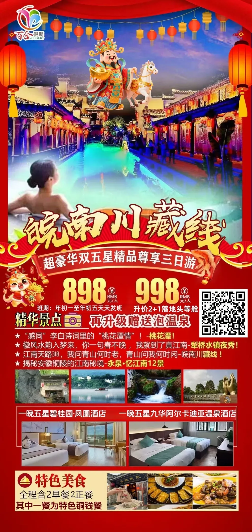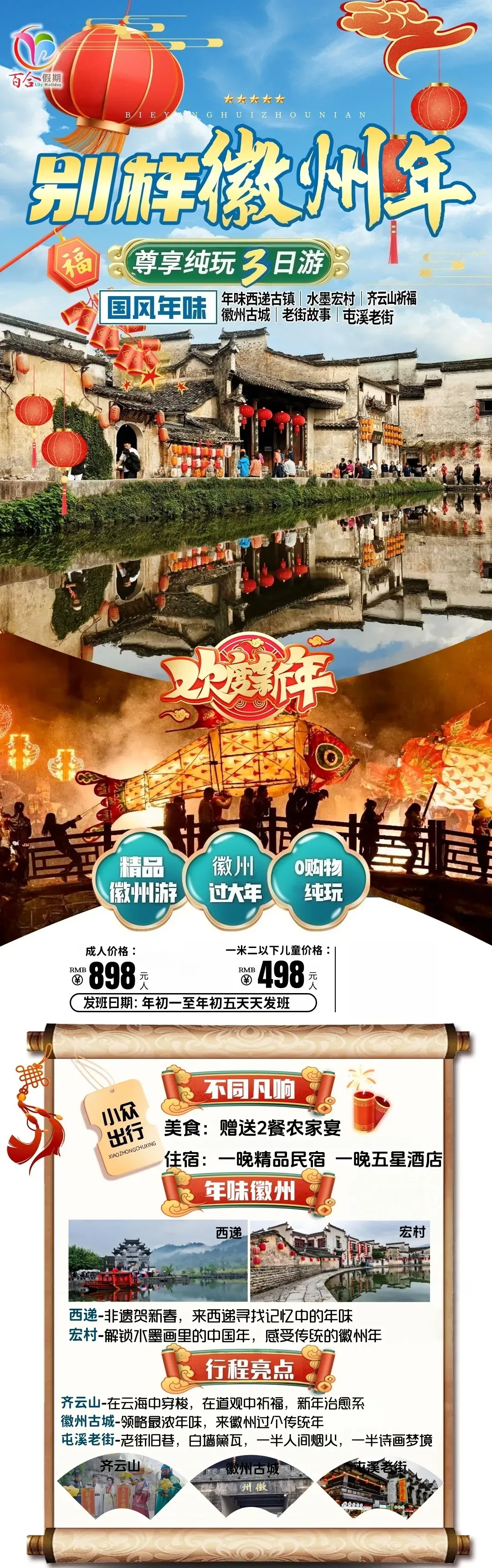 徽州年味、宏村、西递、永泉12景、徽州古城、齐云山祈福、升级1晚五星住宿、赠送2餐