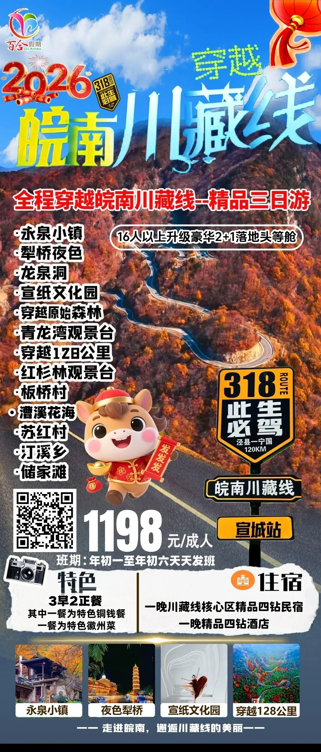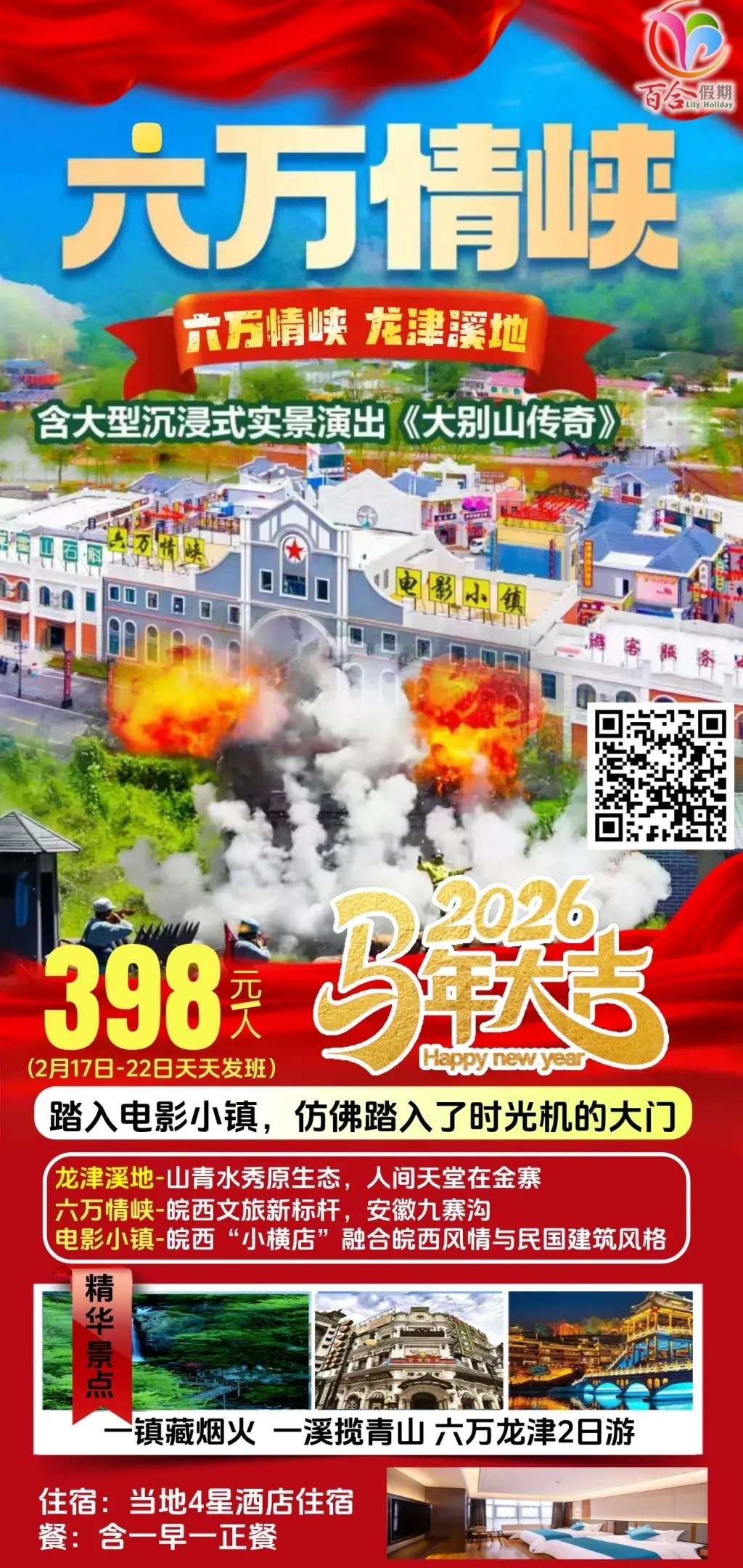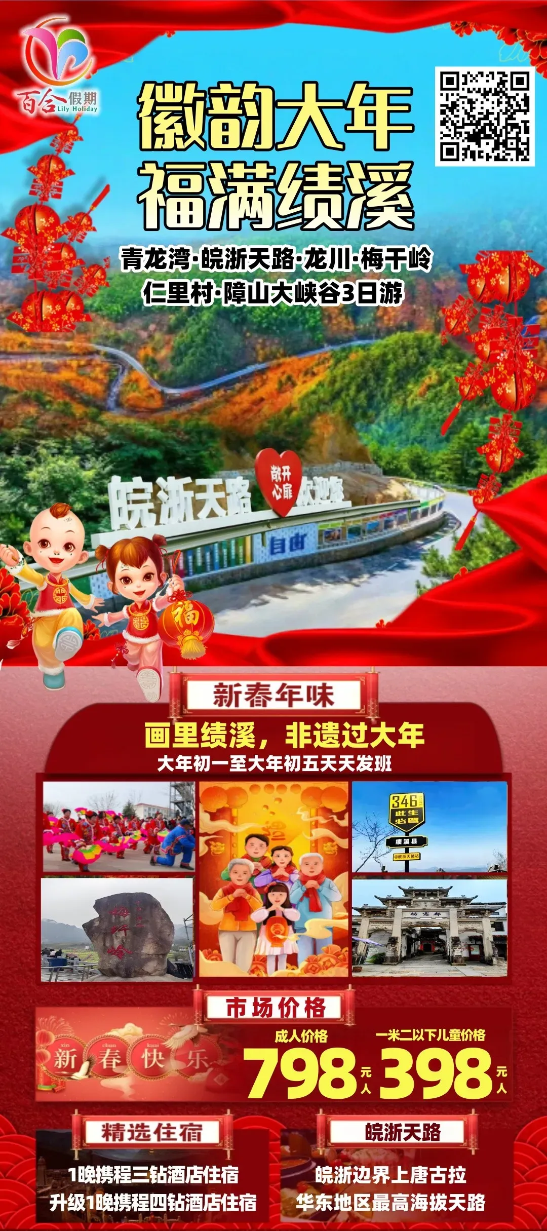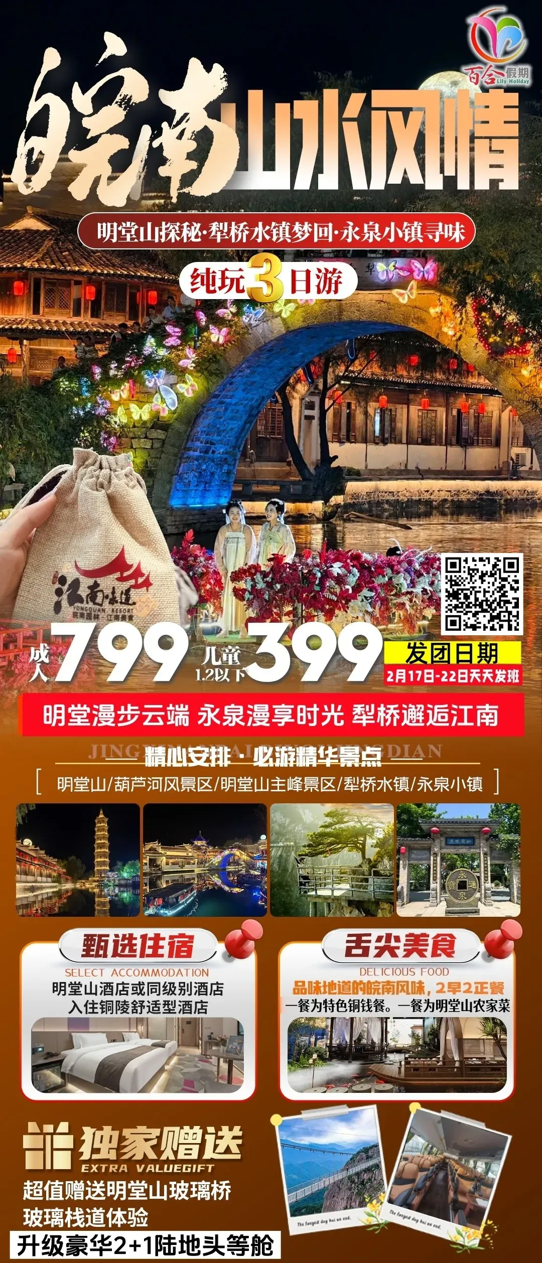 徽州年味、宏村、西递、永泉12景、徽州古城、齐云山祈福、升级1晚五星住宿、赠送2餐