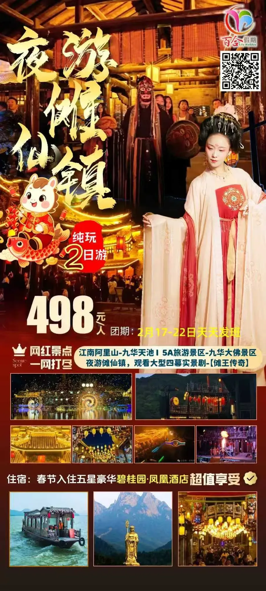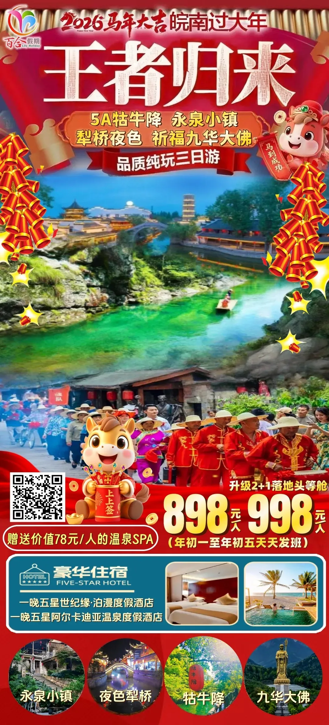 双五星住宿、犁桥水镇夜秀、永泉12景、桃花潭、九华大佛祈福、温泉SPA、赠送2餐