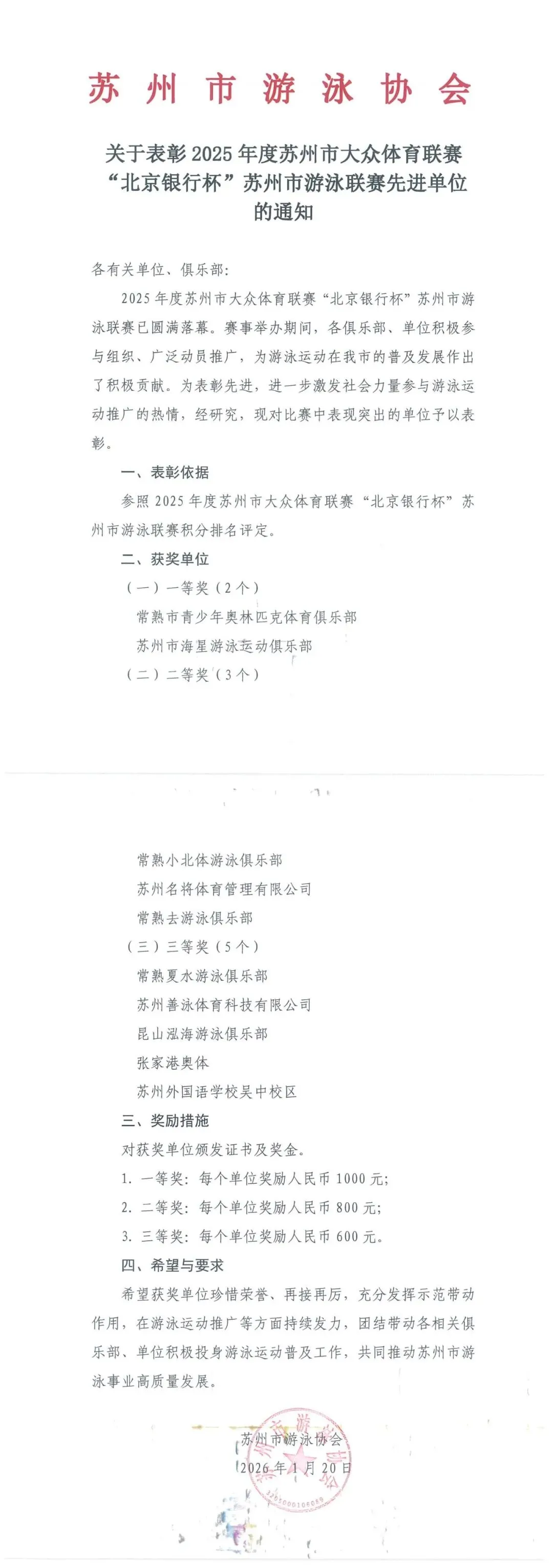 >关于表彰2025年度苏州市大众体育联赛“北京银行杯”苏州市游泳联赛先进单位的通知