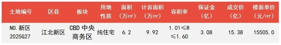 1月21日,2026年首场土拍成交江北新区1幅住宅用地,由南京新高市政以总价15.3833亿元竞得。NO.新区2025G27地块位于江北新区核心区的政务板块,用地面积62009.29㎡,综合容积率1.6,紧邻江北大道快速路和规划地铁13号线万寿路站,邻近在建地铁11号线临滁路站、育英二外、七里河和管委会,区位优势十分优越。地块周边有花语熙岸、天宸云筑、凌云府等多个住宅小区,居住氛围浓郁。
